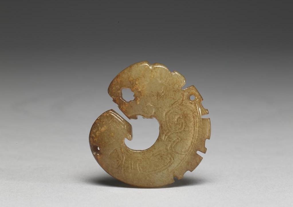 玉质,呈青灰色。雕一蹲踞状的侧面人像,人的胸膛和一龙母题相结合。人头顶上有一方形凸起,钻有一孔,用以穿系。