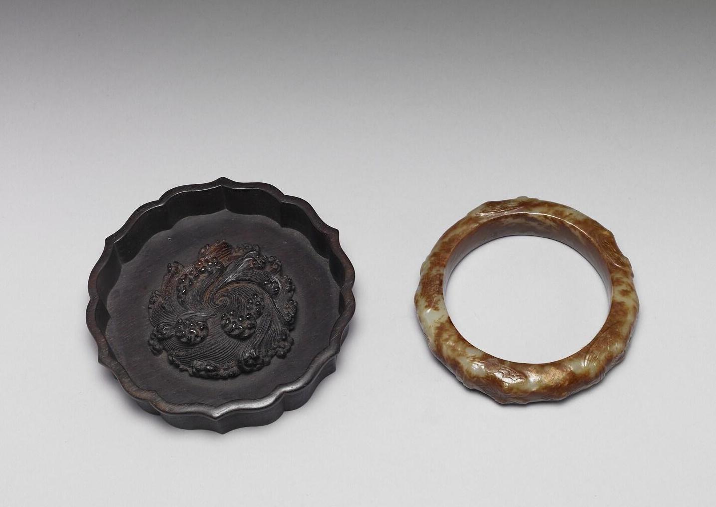 原为碧玉,现呈深褐色,原因除了早先埋藏受沁变色之外,收藏流传过程中可能也略有染色。此类双身兽纹玉璧于战国中期开始出现,西汉广为流行。常见于大贵族墓中,或作为棺上嵌件,或枕于墓主人头部下方及前胸后背。此外,也常见于祭祀遗址中,可知此类大璧虽然制作看似简略,但规格极高,绝非一般之物。乾隆皇帝对此玉璧详加观察考释,并赋诗于玉璧器缘和木座背面。题诗内容为:「制传自姬周,称谓率炎刘,名实何常定,完全喜尚留,夔纹围外致,栗颗蔟中稠,庇荫登嘉榖,王孙宝有由。乾隆戊戌仲春御题。」(四十三年,1778)