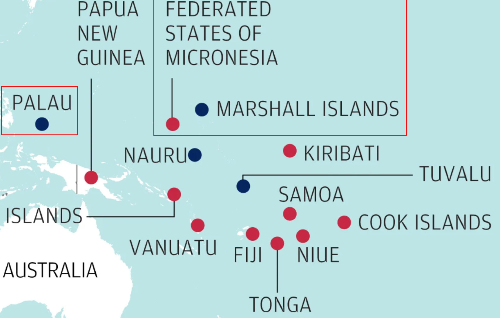 密克罗尼西亚联邦 、马绍尔群岛和帕劳在太平洋的位置图(红框内)图自《南华早报》