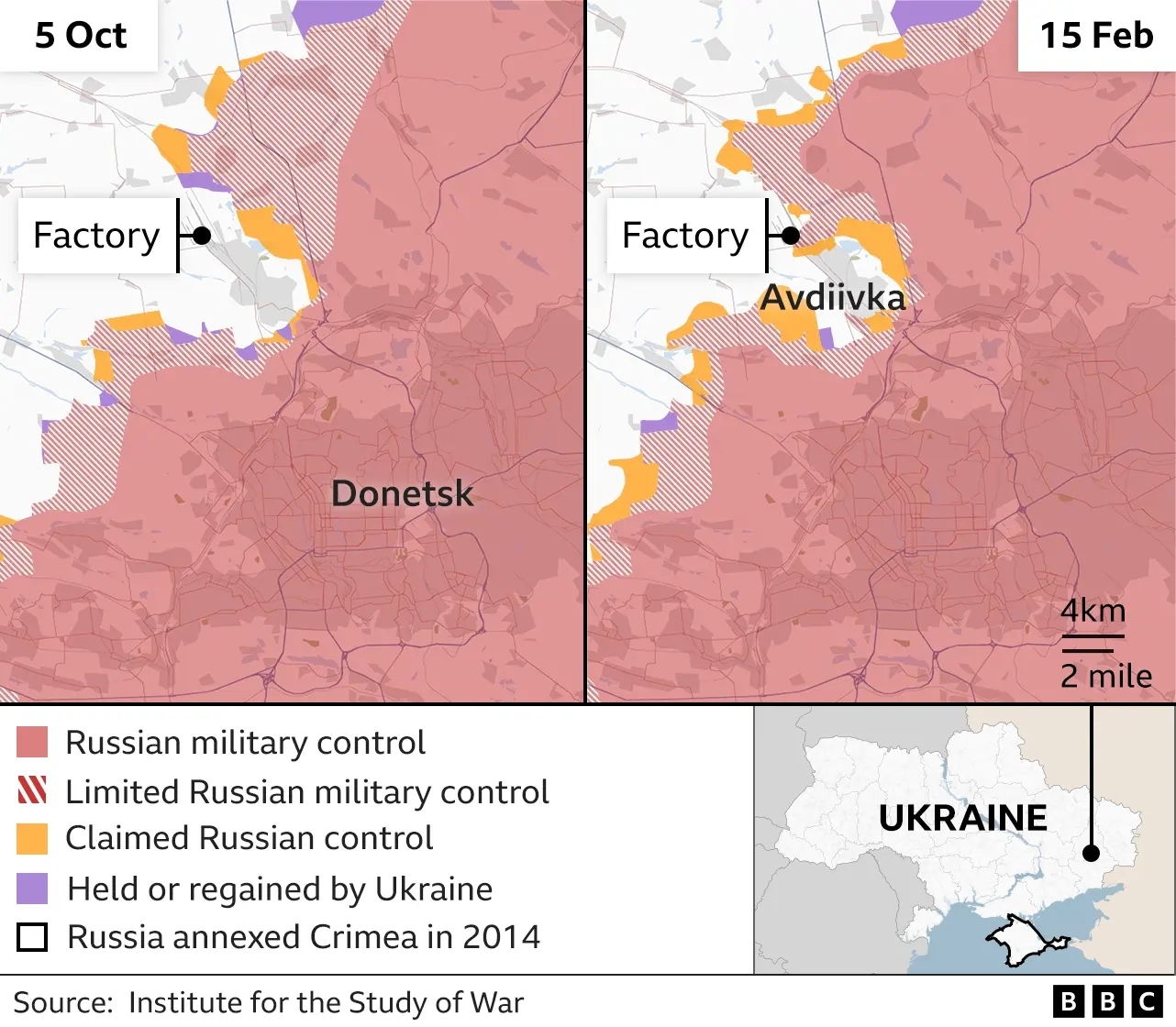 阿夫杰耶夫卡位于顿涅茨克地区首府以北不到10公里,是乌克兰开展防卫的军事重镇。自去年10月左右以来,俄军对乌东部的阿夫杰耶夫卡、库皮扬斯克、马林卡、巴赫穆特等地乌军防线发动新一轮大规模攻势。