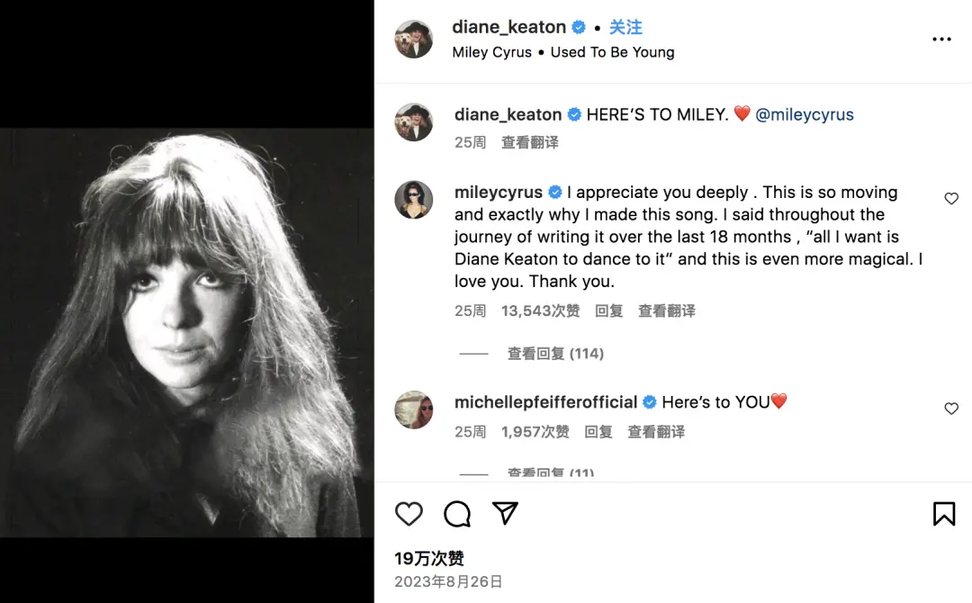 除此之外,当时这首歌发布之后,另一位传奇女演员、奥斯卡影后Diane Keaton同样也在自己的社交媒体账号上表达了自己对Miley的喜爱。“这首歌绝对棒极了。我总是告诉你,你太棒了,你所做的一切令人惊叹。我更爱你!❤️”