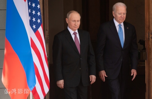 资料图:当地时间2021年6月16日,瑞士日内瓦,俄美首脑峰会举行,俄罗斯总统普京和美国总统拜登举行会晤。图自澎湃影像