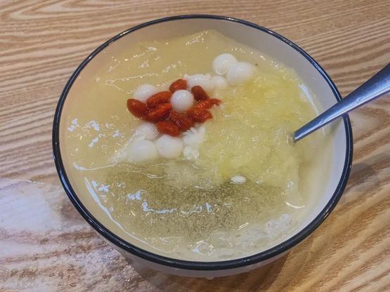 冰粉里的三鲜指的是:银耳、醪糟、小汤圆。银耳的绵软滑嫩,小汤圆的软糯,醪糟的微微酒气,和爽滑的冰粉在一起搅拌均匀,齐齐送进嘴,感觉一切都可以原谅了。
