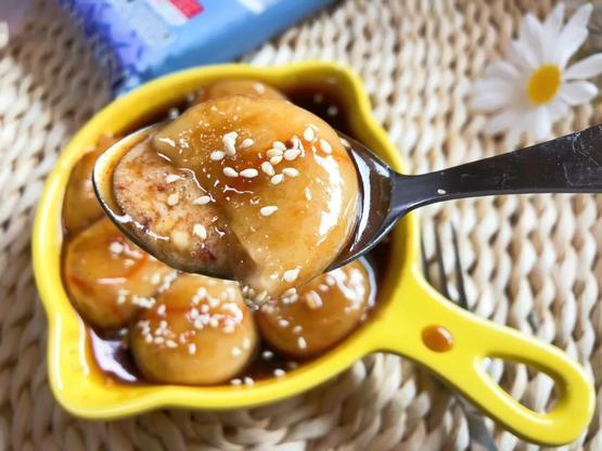 先将汤圆小火煎至金黄,然后加入红糖和水,将糖水收汁到粘稠,最后撒一把香喷喷的芝麻就齐活。