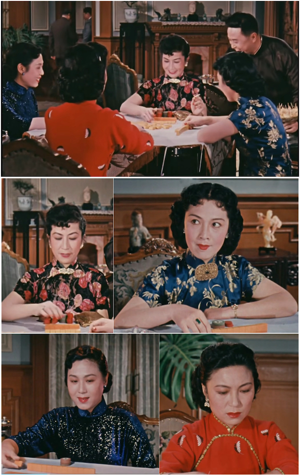 除了丝绒旗袍以外,电影中还有一段重要场景,张伯韩为了跟洋行买办周旋,特意在家中宴客,当天他因为工厂临时出事无法及时赶回,只得由妻子、妹妹和弟弟夫妇出面招待买办和他的交际花女友。中间有一个场景是四个女人饭后坐下来打麻将,弟弟在旁作陪,他暗示大嫂和妹妹,于是大家顺理成章地输了牌。这段麻将戏拍得流畅自然,也很能显示人物性格,其中的服饰同样恰如其分地表现出那个时代和阶层的生活特征,4件长旗袍色彩饱和度很高,鲜明有光泽,花纹丰富,华丽感十足。汤晓丹说自己曾经想用三种不同色彩来区分电影的三个不同时期,只是因为当时摄影师对彩色胶片的使用不够熟练而未能达成目标,他设想中的这一时期应该是黄色的。虽然胶片没能做到,但美术师选用的华美明艳的服饰至少也部分完成了这个设想。除了各有特色的旗袍,张伯韩妹妹和买办女友领口的大别针也是极具时代特色的饰品。