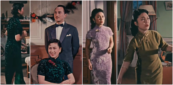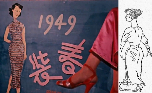 五十年代以前彩色电影实在很少见,《不夜城》的拍摄时间和故事发生的年代非常接近,葛师承对1940年代末期的服饰和时尚的熟稔以及表现方式也使得电影因此留下了值得重视的资料,比如电影甚至还出现了一个有趣的服饰细节,百货公司橱窗里布置着最新的时装,后面是画有1949春装的广告牌,街边有熙熙攘攘的买卖银元的人群,时代背景点染的恰到好处,而春装的时装画分明就是1948-1949年一度盛行的“美龄装”,这种旗袍身长过膝,高领束腰。解放后也继续流行过一段时间,1950年的《亦报》上还有人撰文画图嘲讽过这种时装,称之为“螳螂式的长旗袍”。电影里不过是几秒闪过的一个镜头,美工师对那个时代服饰的把握完全是举重若轻的精准。