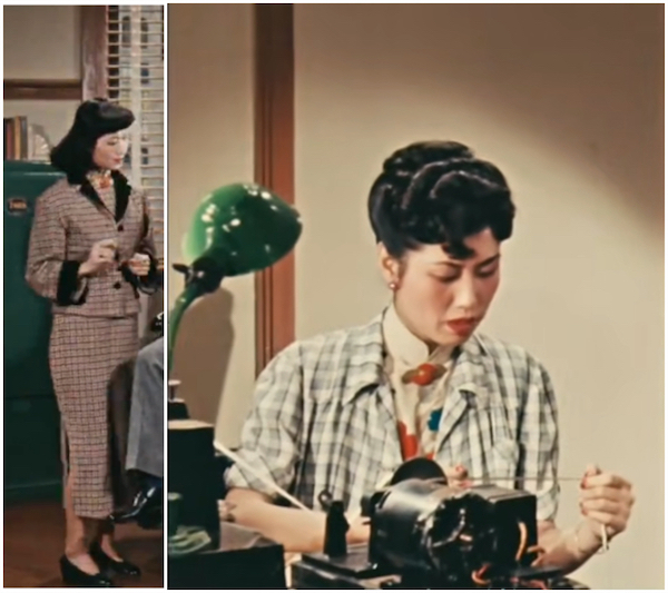 最后还有一点也值得注意,主要角色以外,有两个场景出现了张伯韩公司里的两位女性职员,这两位只有一句台词,各自出场一次,却是极少在电影里看到的1940年代末办公室工作的职业女性的衣着,分属不同季节,是厚薄各异的旗袍+外套,也和其余女性角色的服饰风格大不相同。这种地方都可以看出美术师的用心。