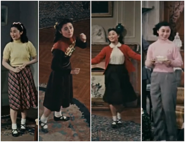 上图左一到左三都在解放前,右一是1951年,从电影表现看,解放前后她的日常衣着几乎没有变化。而她和同学在一起时,这种特点也很明显。
