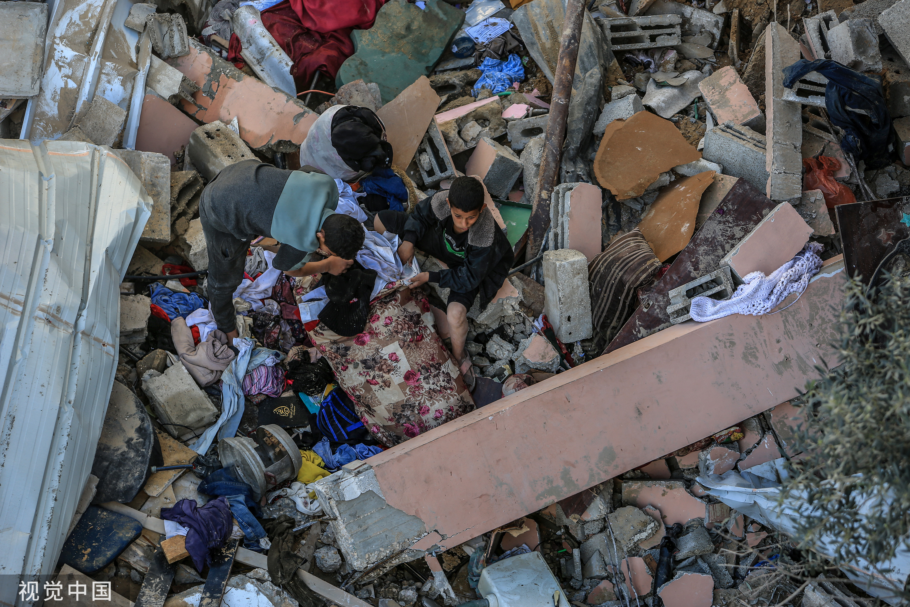 当地时间2024年3月12日,加沙地带拉法省,以色列袭击了Abu Jazzar家族的建筑后,巴勒斯坦居民试图在废墟周围收集他们可用的物品。