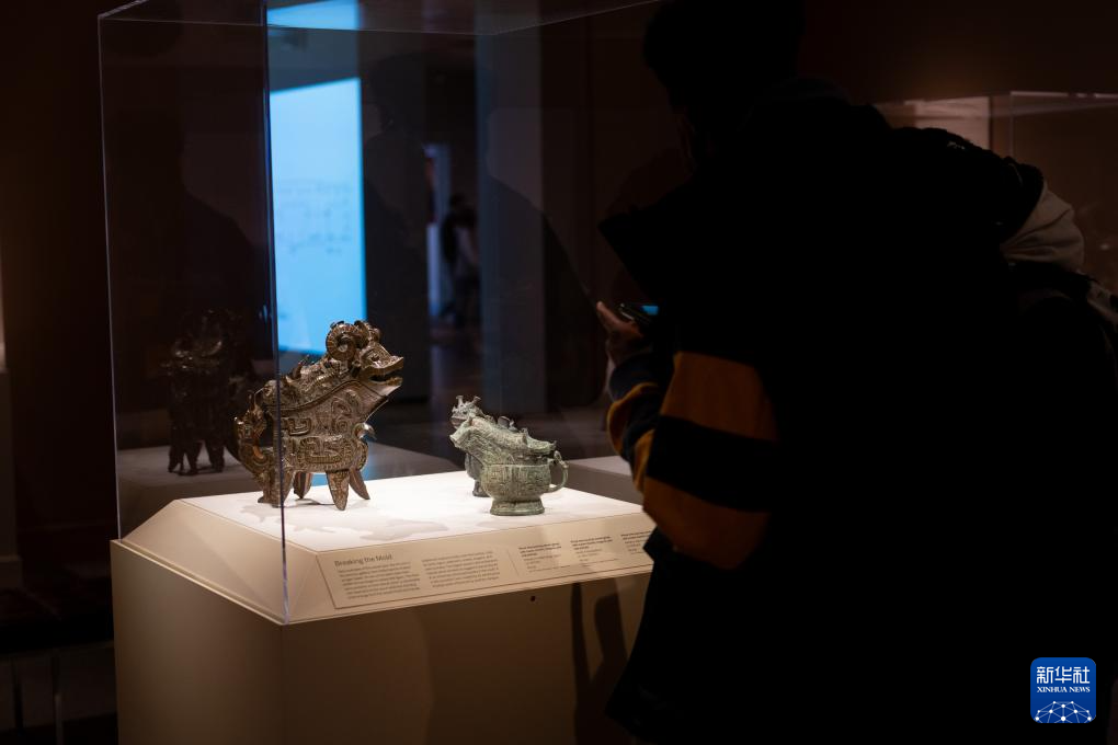 3月11日,在美国首都华盛顿的美国国立亚洲艺术博物馆举办的“安阳:中国古代王城”展览上,一名游客拍摄展出的文物。