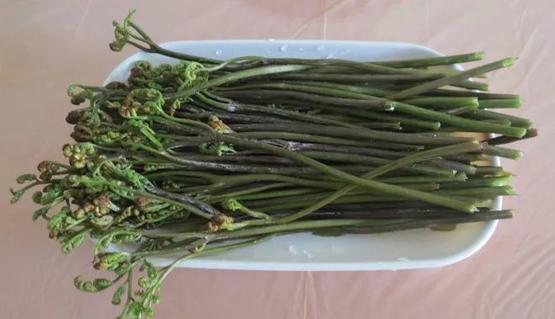 蕨菜,又名龙爪菜、拳头菜,多生长在温带、亚热带的向阳山坡和森林边缘阳光多的地方。采的时候,要挑那种未展开的嫩叶嫩芽。除了芽叶能吃,它的根状茎提取的淀粉也能做成菜,就是蕨根粉。
