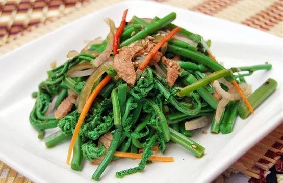 蕨菜最常见的吃法是先用开水焯熟,可凉拌,可搭配鸡蛋和肉类炒,或者晒成干菜,而后用开水泡开就可以下锅了。