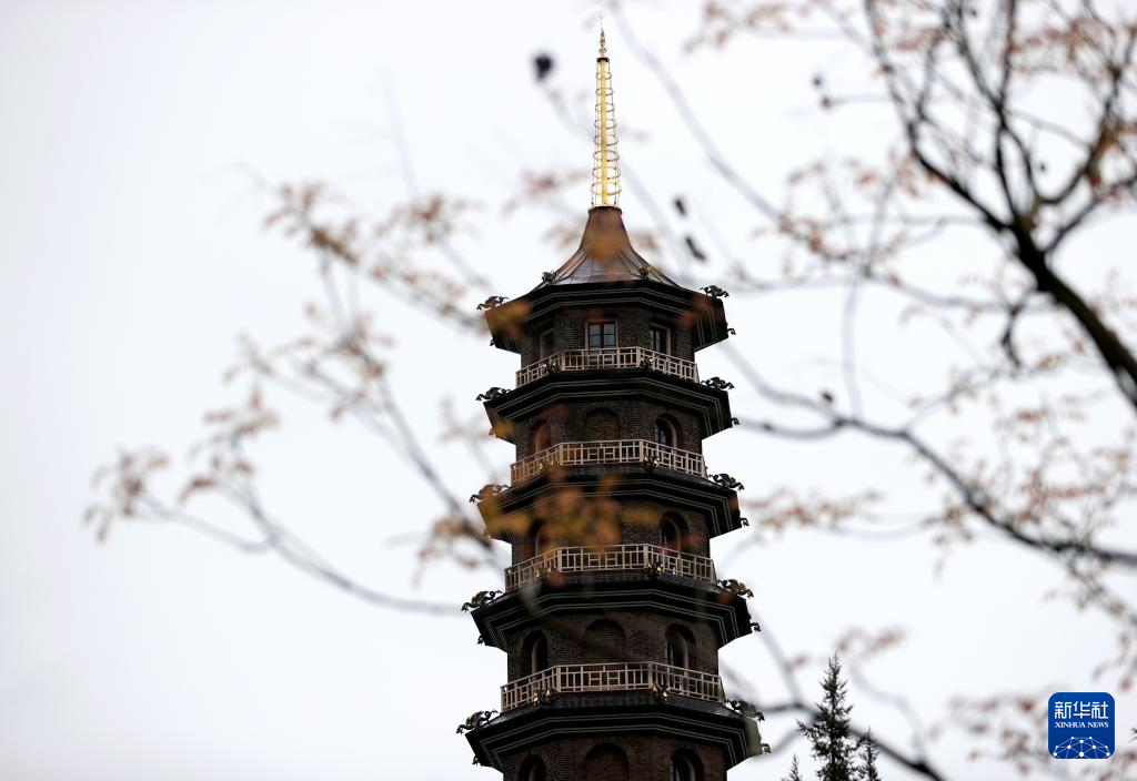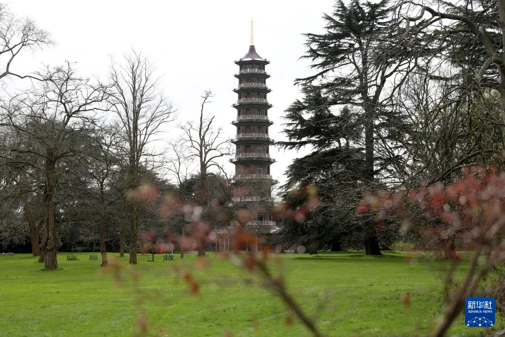 这是3月27日在英国伦敦邱园(英国皇家植物园)拍摄的中式宝塔。