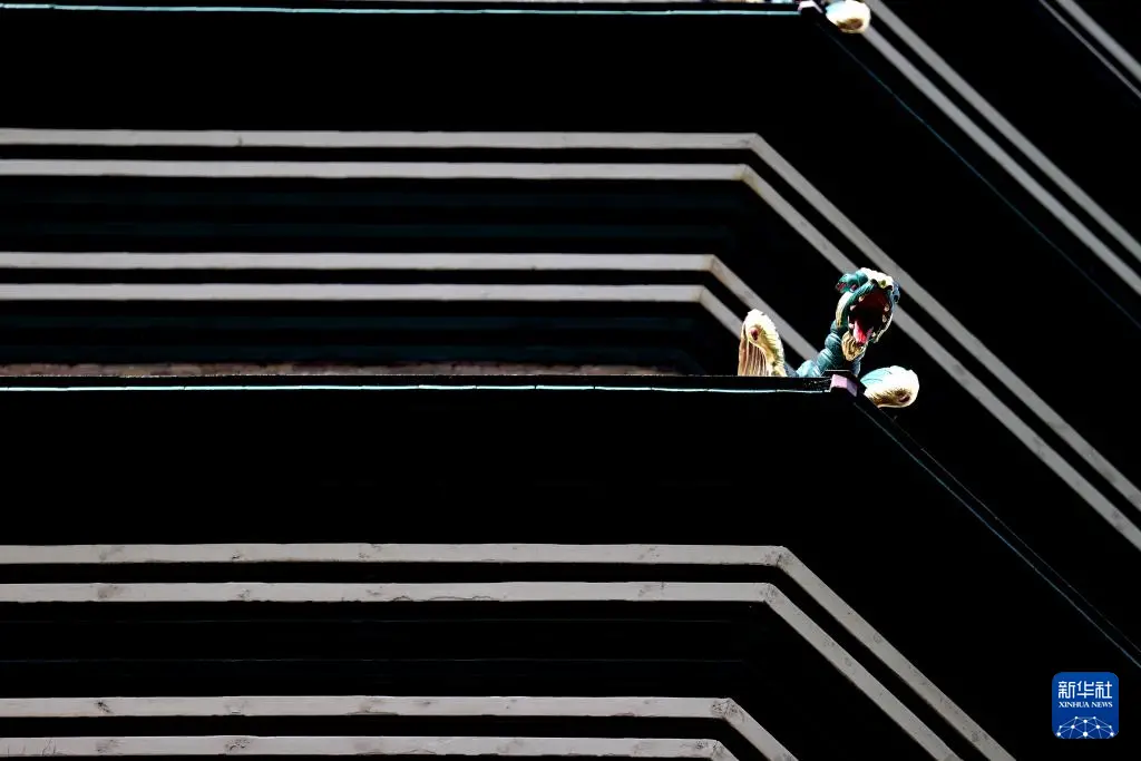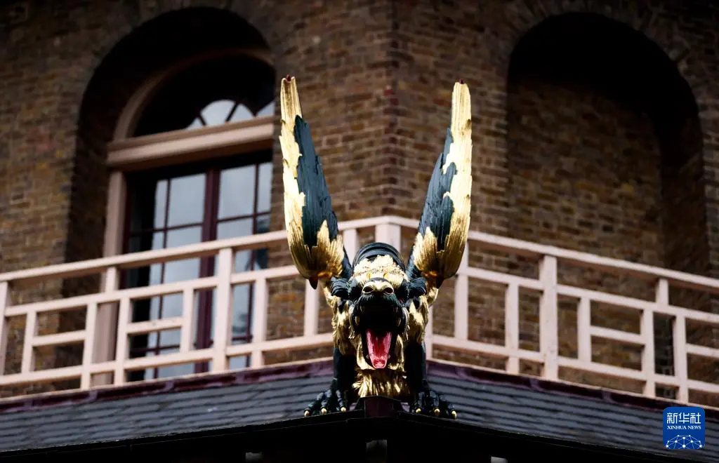 这是3月27日在英国伦敦邱园(英国皇家植物园)拍摄的中式宝塔上的彩色木龙。