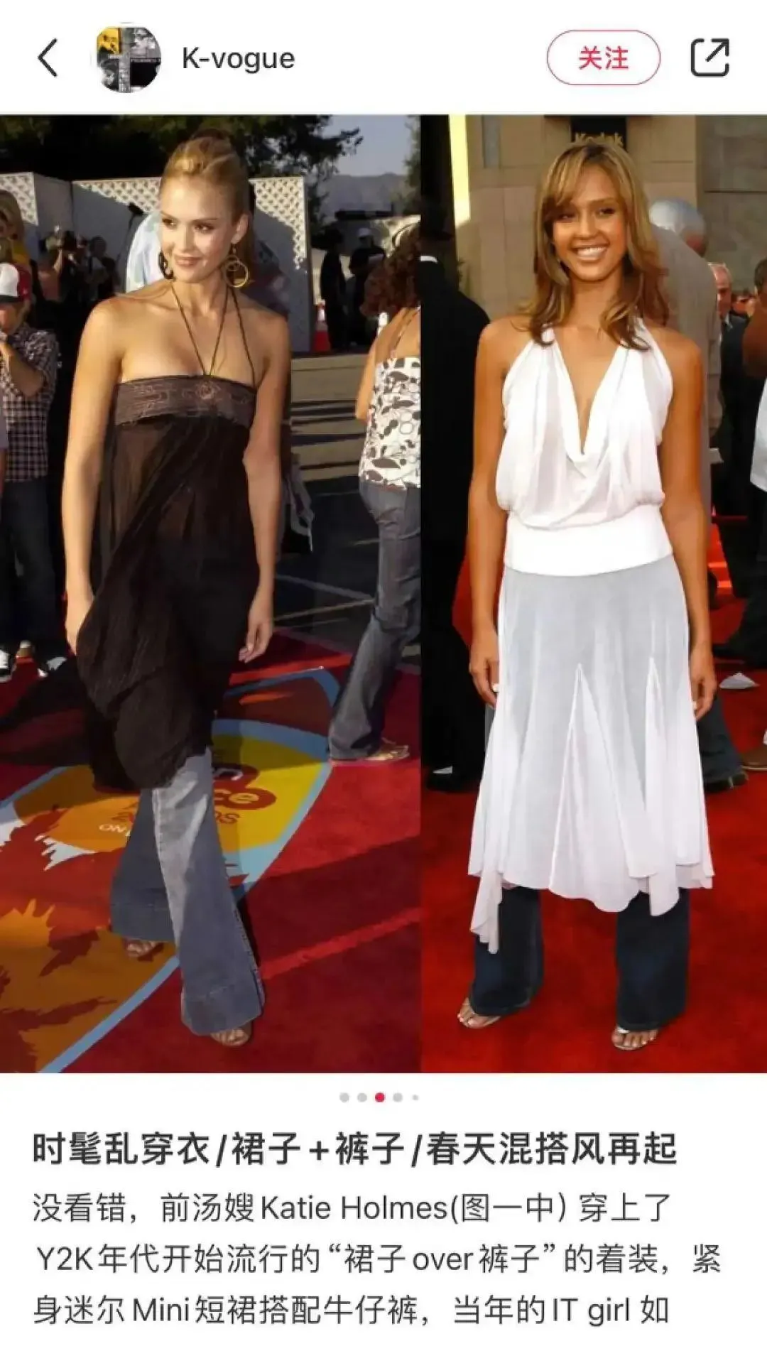后来到了90年代末期,千禧文化盛行,裙裤叠穿“dress over pants”摇身一变换了个名字“Scouser(skirt+trouser)”再次流行。只是和曾经不同,这次在大背景下更强调时尚感和个性化。饰演过《神奇四侠》里隐身女的好莱坞著名女星Jessica Alba就是这个穿搭的忠实粉丝,多次穿上红毯出席活动。