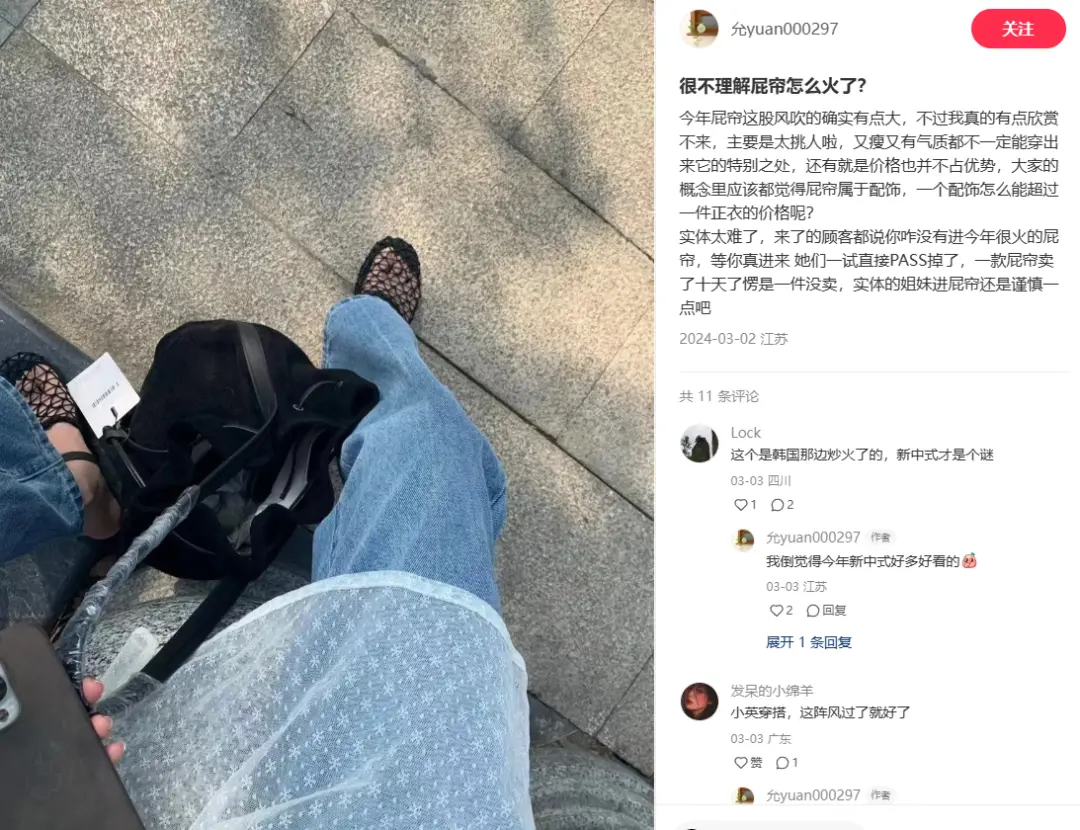 但也不是谁都能欣赏得了,不少网友看着跻身在新中式大潮中的屁帘,颇有些困惑——“今年流行的这个屁帘穿搭,二十年前我们村的一个疯子就是这么穿的。”