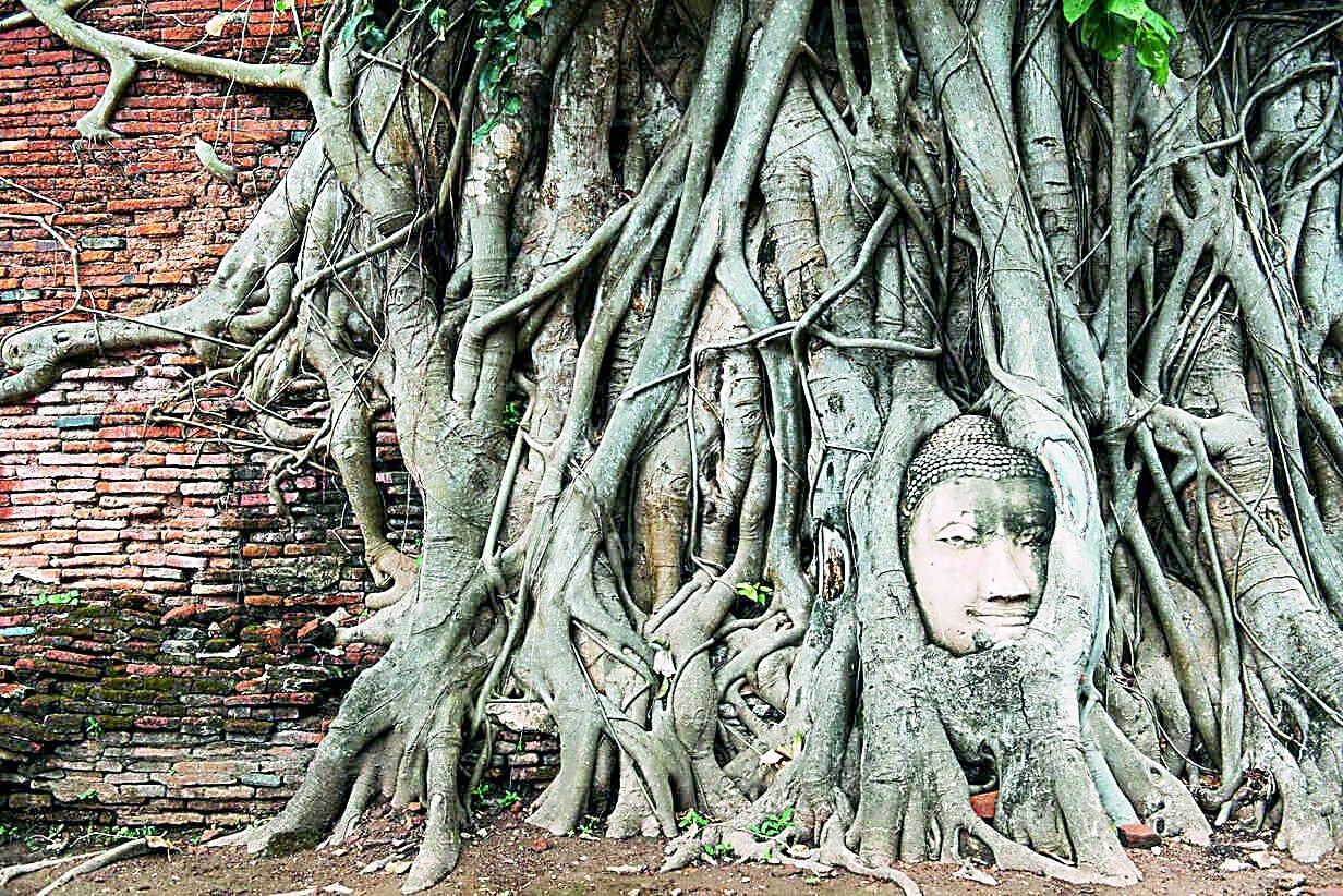 来泰国大城府玛哈泰寺的游客,大都是冲着树抱佛奇观来的。在佛寺遗址旁一颗郁郁葱葱的菩提树下,巨大的树根如蜘蛛网般不分彼此互相缠绕,目光扫过这片密密麻麻的根蔓时,突然有一张人脸浮现其中。定睛一看,原来是一尊佛头,紧紧地被菩提树根环抱。浅灰色的佛头和四周树根已经融为一体。佛像面容安详,注视前方,宽阔的额头和鼻梁下,划过一抹淡淡的微笑。泰国人称其为“暹罗永恒的微笑”。这笑容仿佛跨越千年,深深地印刻在每一位观者心中。