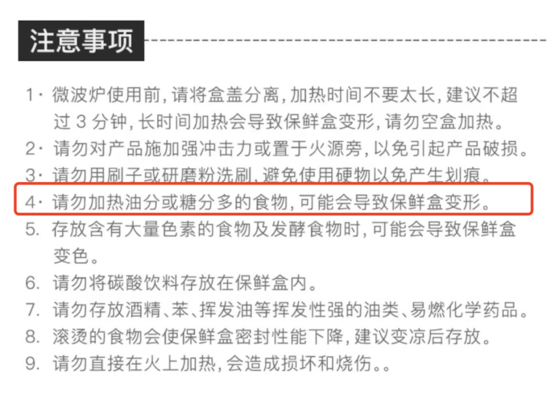 因此,即使是可以重复使用的聚丙烯便当盒,很多商家也会标注不要加热高油高糖食物。