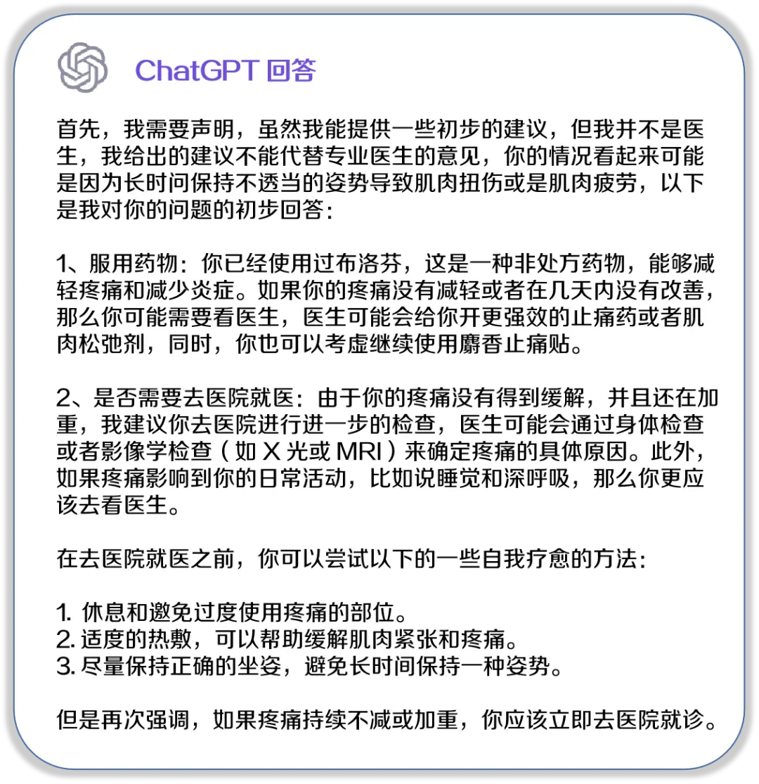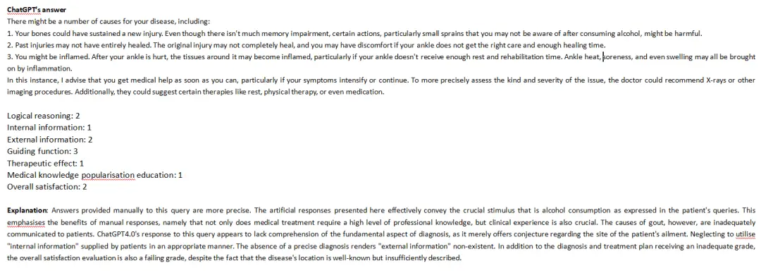例如,当患者只能描述关节肿痛的症状,而不能给出更多其他信息,ChatGPT 就不能联想到痛风的诊断。此时,医生的专业评估和监督就不可或缺。