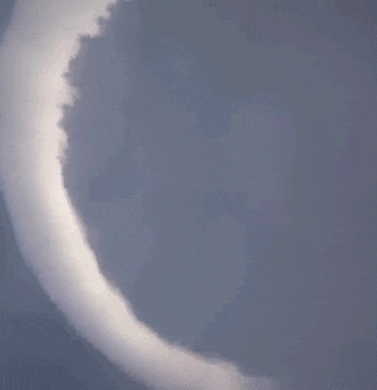 接下来的关键就是圆形的火山口了:岩壁会在边缘“搓”一下这团气体,手法有点像早点摊上搓一个面圈。如果火山口的形状够圆,它就能搓出一个以1.5倍音速翻滚的完美白色涡环。