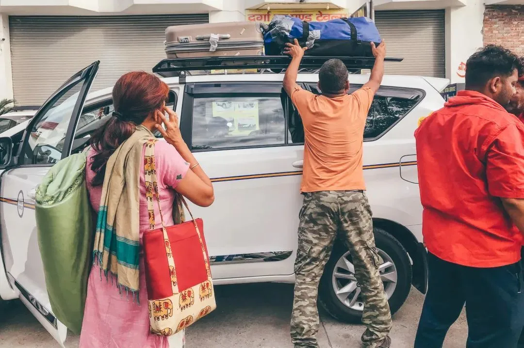 因为行李多,同伴在下车后与搬运行李的人交涉价格。接下来也是看到令我惊讶的画面,他们把硕大的,超过15公斤以上的行李往头上顶,轻一点的行李,在头上形成2~3层的高度;印度人就这样“搬运”我们的行李。