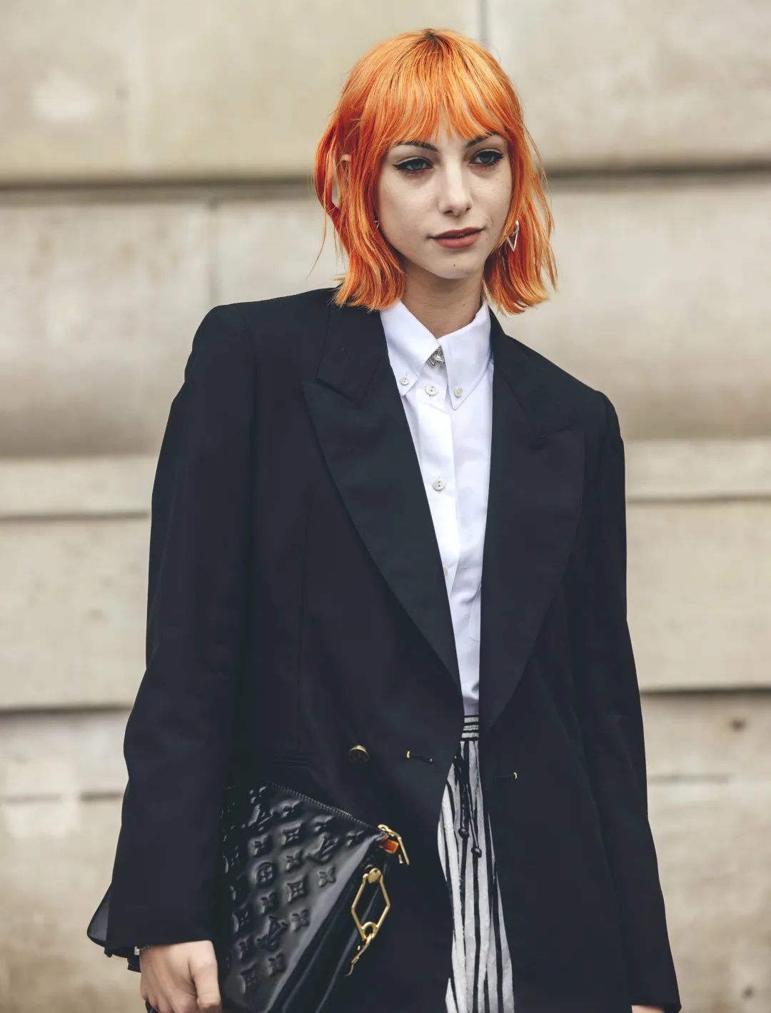 一刀切短发的发尾一定要直,如果长度在下巴以下,那么一定不能内扣。海莉的一刀切粉色短发,加入一点点湿发元素,整体时尚感立刻升级。