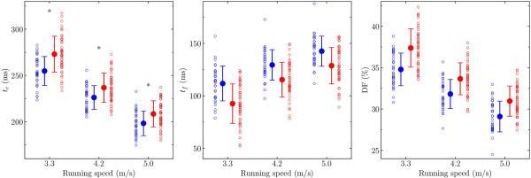 直觉型和感觉型跑步者的跑步形式的时间特征。a. 接触时间(tc);b. 飞行时间(tf);c. 责任因子(DF)。直觉型跑步者(左侧,蓝色符号)比感觉型跑步者(右侧,红色符号)展现出更短的tc(p = 0.002)、更长的tf(p < 0.001)和更低的DF(p < 0.001)。图片来源:PLOS ONE杂志