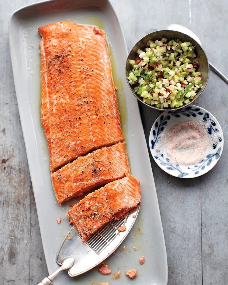 水煮三文鱼是一种健康的烹饪技巧,低脂肪高蛋白,可以帮助你填饱肚子,抑制食欲。用香草、柠檬和香料先将三文鱼煮熟,上桌再配上美味的油醋汁或蒜泥番茄罗勒酱。