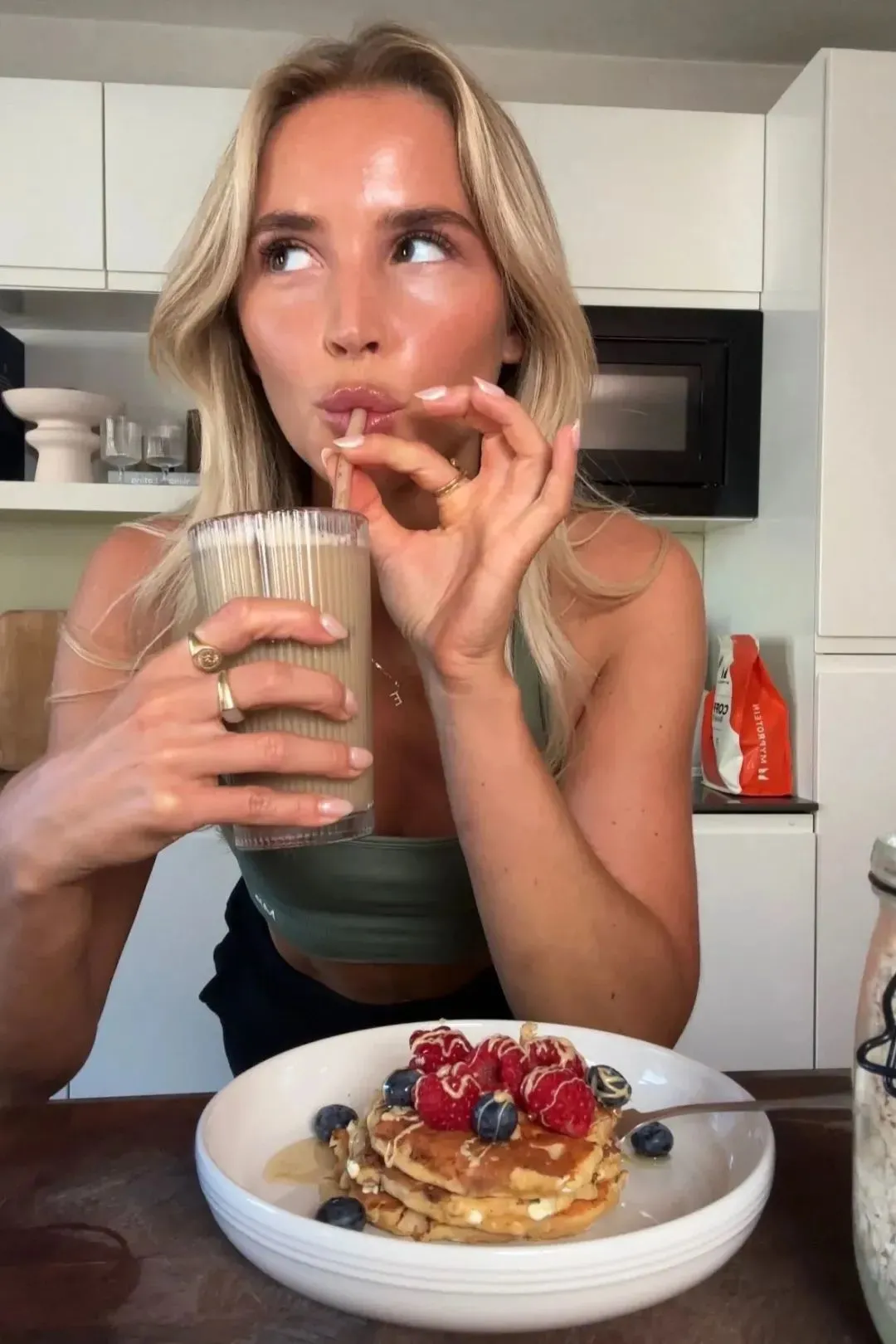 她在健康饮食方面和其他健康日程一样,保持数十年如一日的“卷自己”,她分享道自己每天醒来后做的第一件事就是喝几匙苹果醋,和David用大量蔬菜制作绿色冰沙。