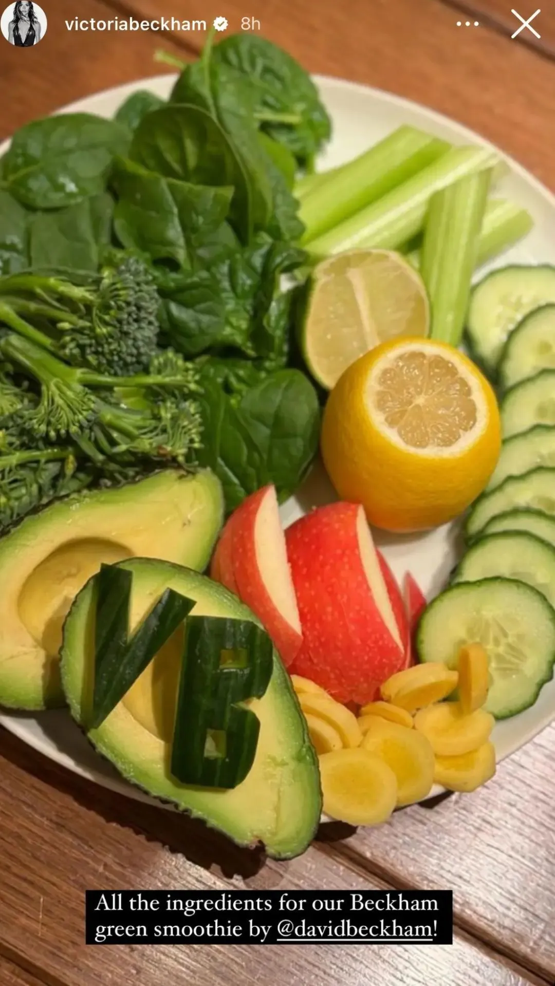 Beckham夫妇家必备的蔬果,含有菠菜、西兰花、芹菜、黄瓜、鳄梨、苹果、柠檬和生姜,富含抗氧化剂、抗炎、植物性营养和纤维。尽可能吃真正的食物,而不是它们的加工版本,比如吃柑橘而不是喝果汁(果汁中通常含有添加糖,而且纤维被消除)。