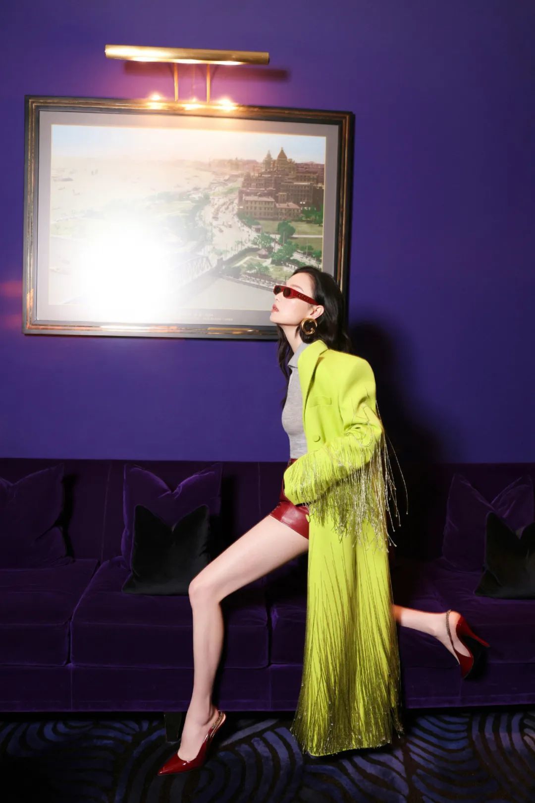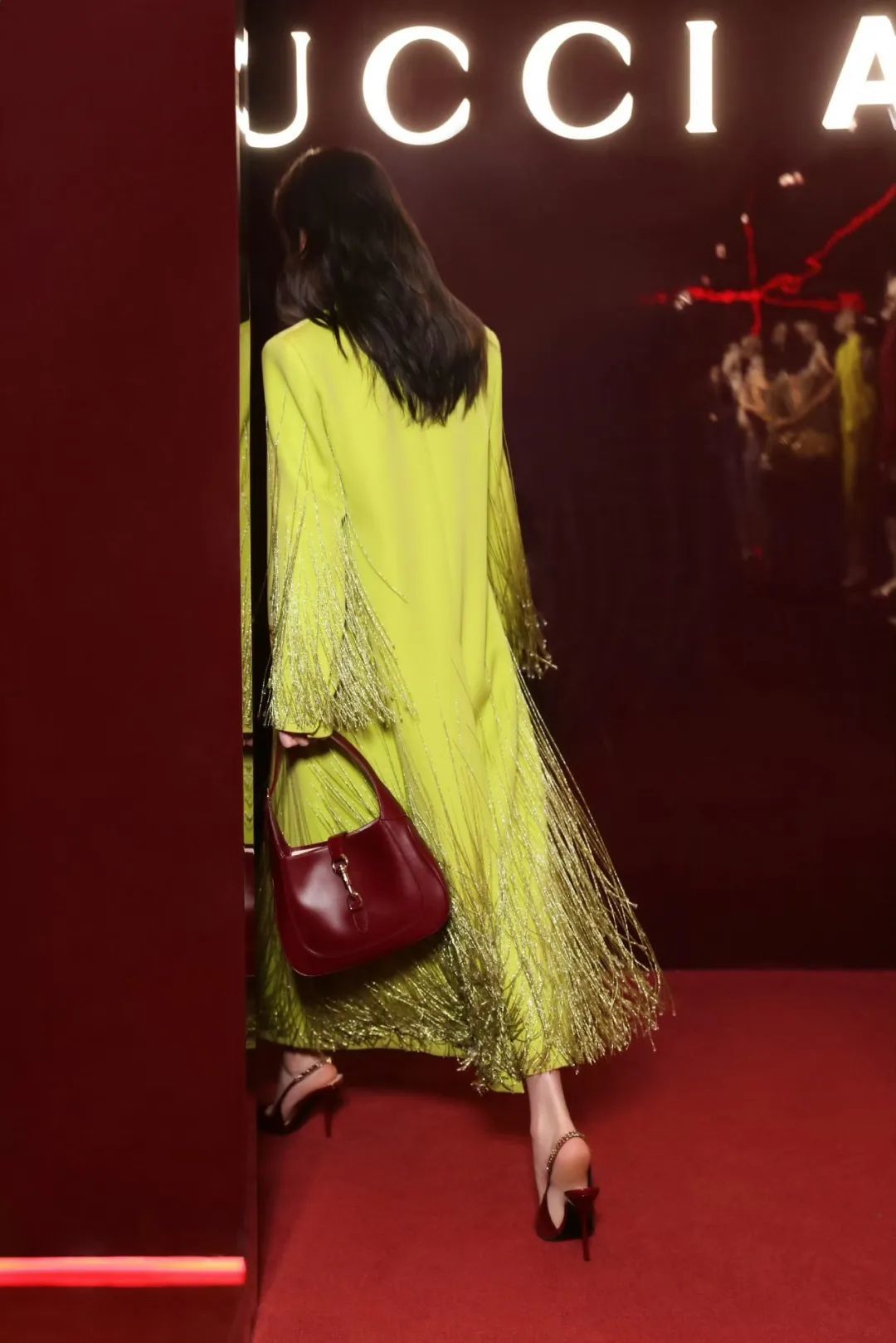 可以巧妙利用的配饰不只是鞋子,前几天倪妮参加GUCCI晚宴时,一身绿色流苏风衣亮相,穿了一双安可拉红色高跟鞋,并和同色系手袋及墨镜呼应,非常美艳吸睛。
