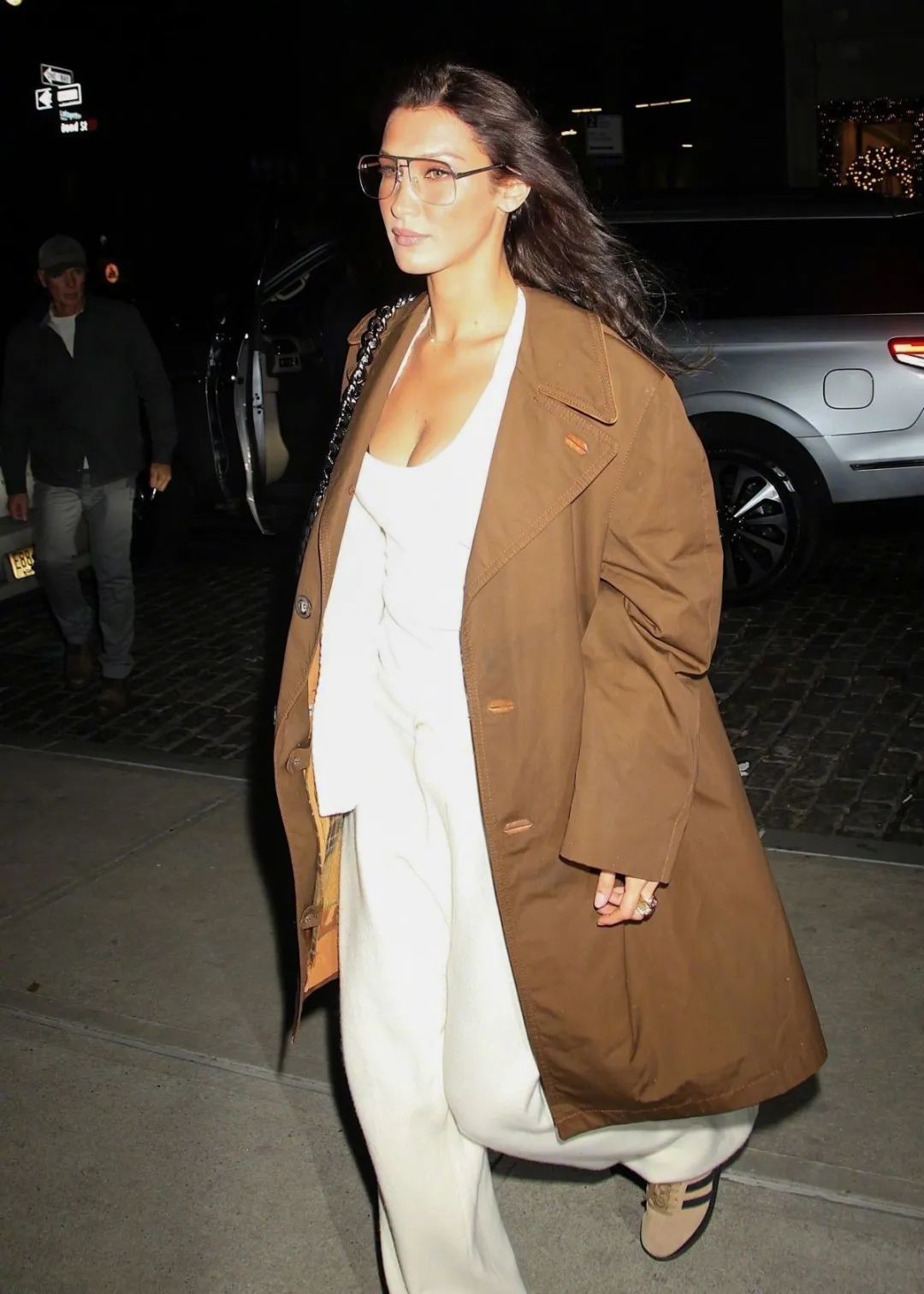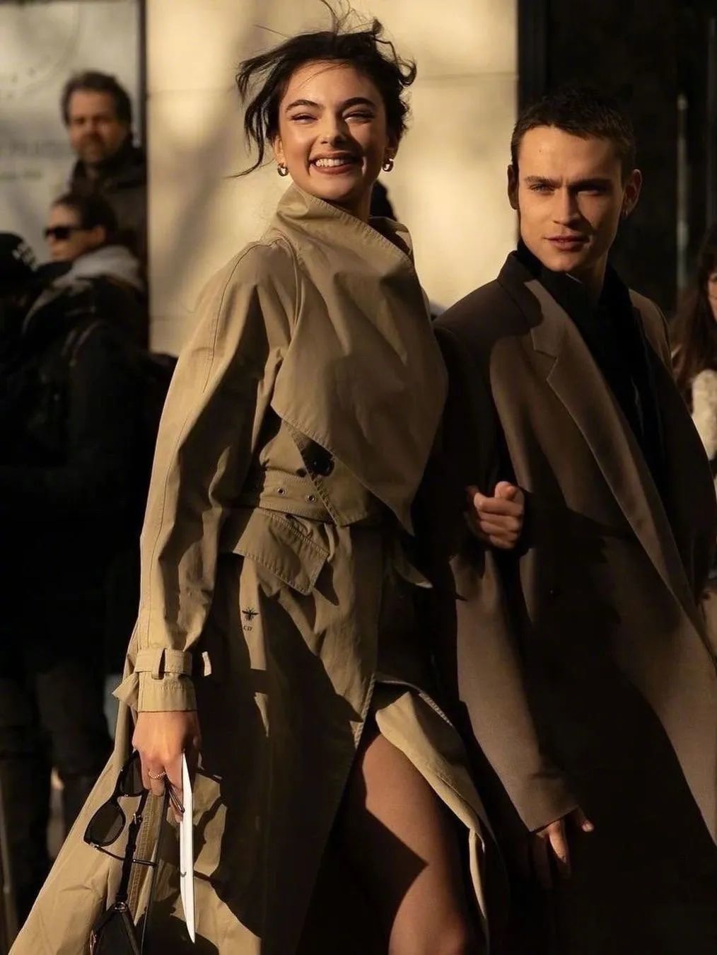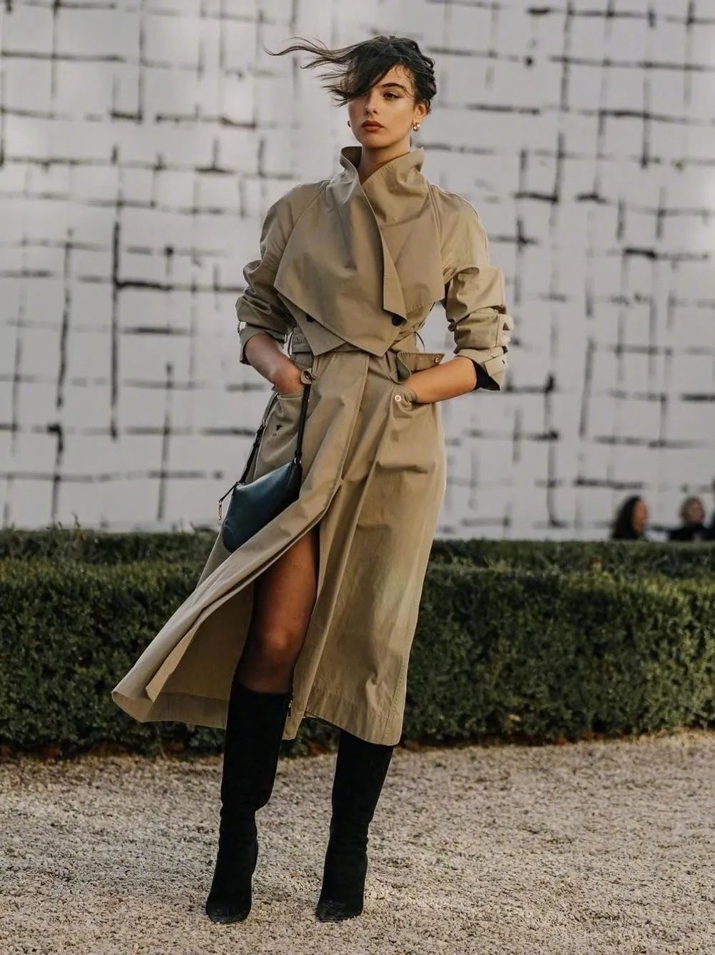 Deva Cassel在参加Dior 2024春夏高级订制秀场时,穿了一套卡其色的风衣,并选择将风衣的扣子系起,用收腰的方式来穿,Deva为这件风衣搭配了一双黑色的细高跟靴子,一双美腿在风衣下摆间若隐若现,完美遗传了妈妈莫妮卡·贝鲁奇的风情万种。