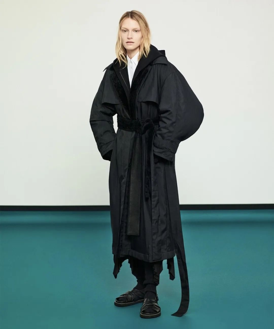 而柔软的裤子会中和H型风衣的硬挺特质,否则就容易显得呆板。
