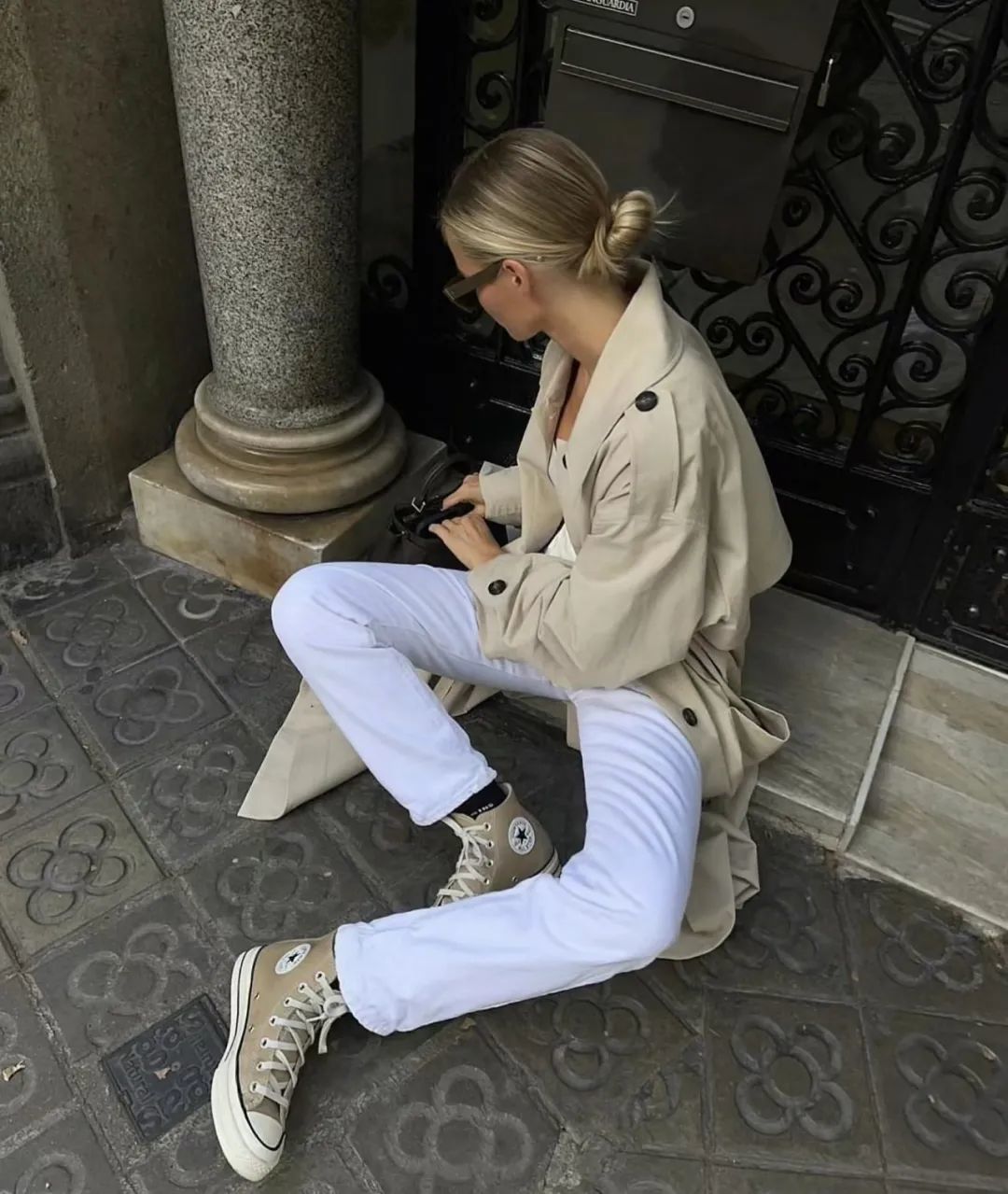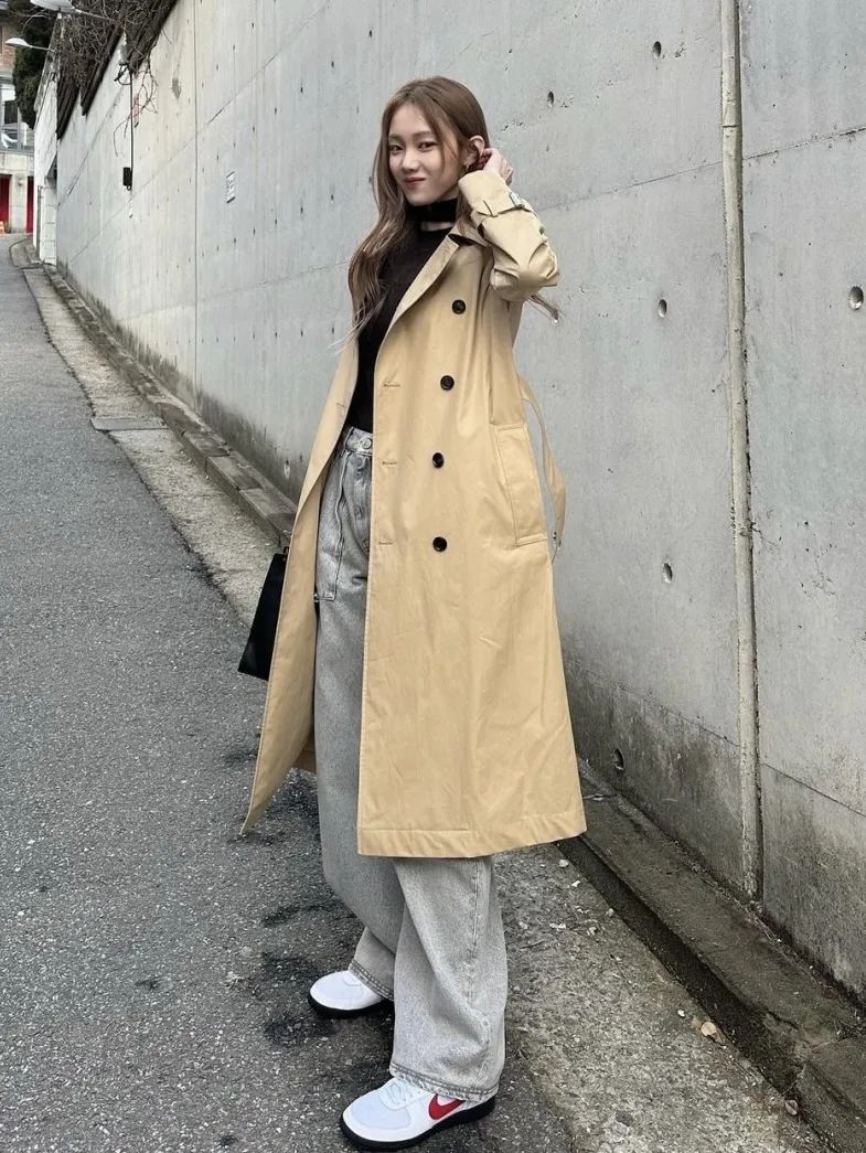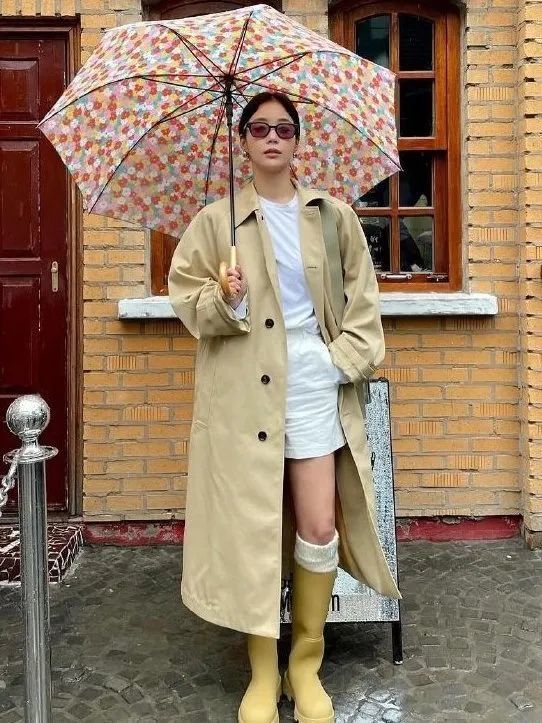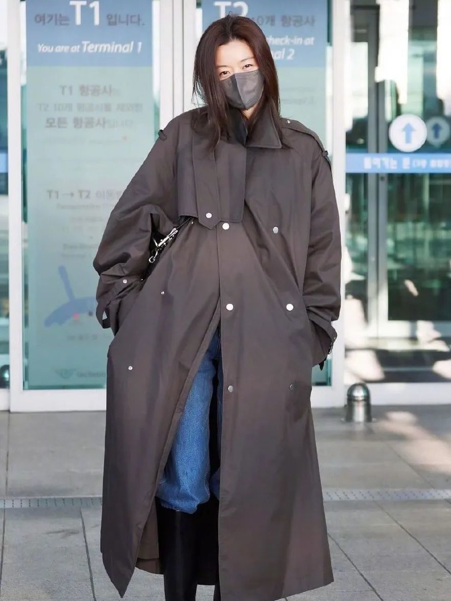 对于廓形的风衣,也可以试试像全智贤一样穿细腿牛仔裤,搭配长筒靴,将裤管塞进靴筒里,就会很时髦。
