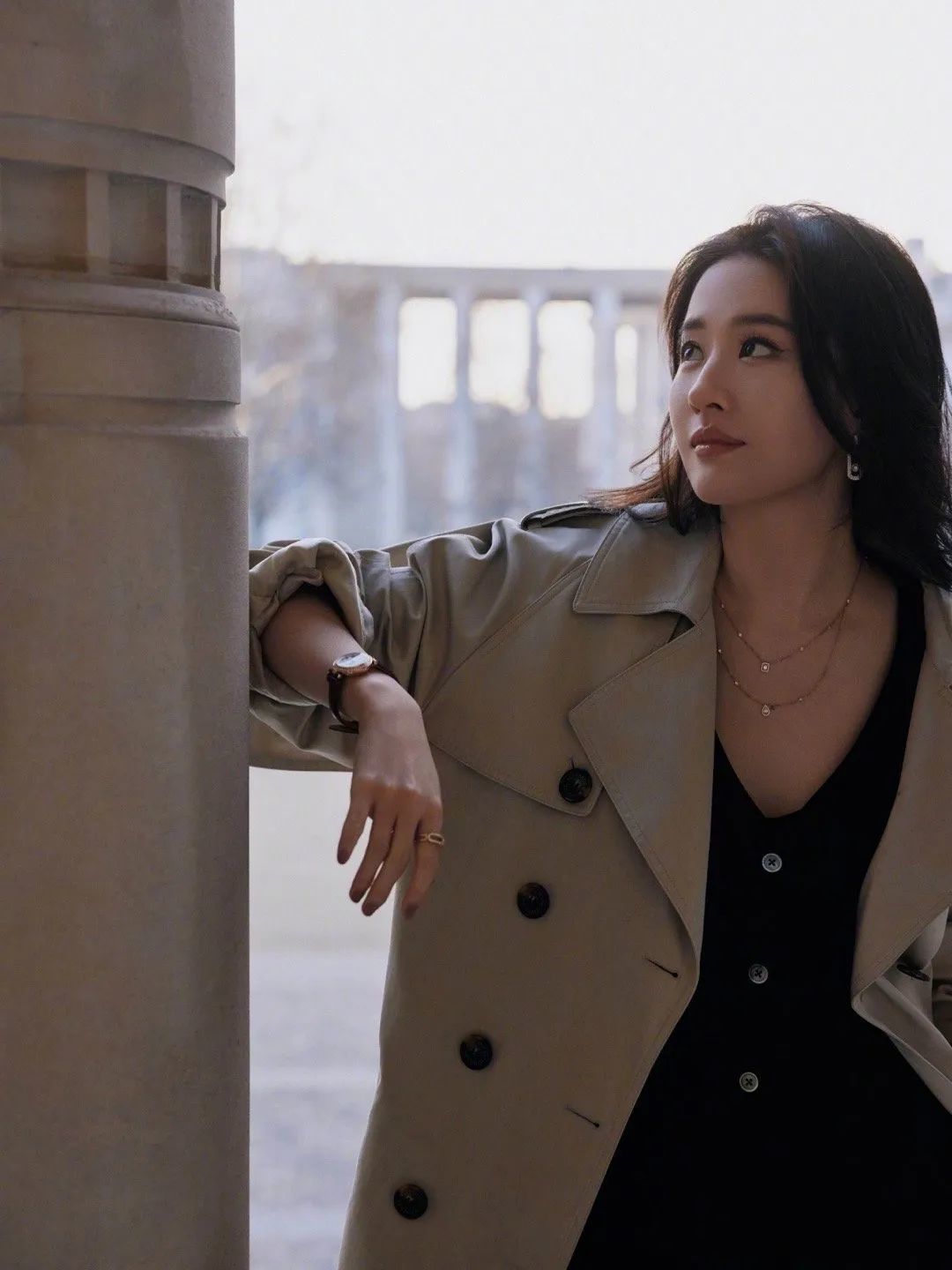刘亦菲则为风衣搭配了一块腕表,也非常值得借鉴,小小的一款腕表并不会喧宾夺主,在不经意间露出来,高智感拉满。