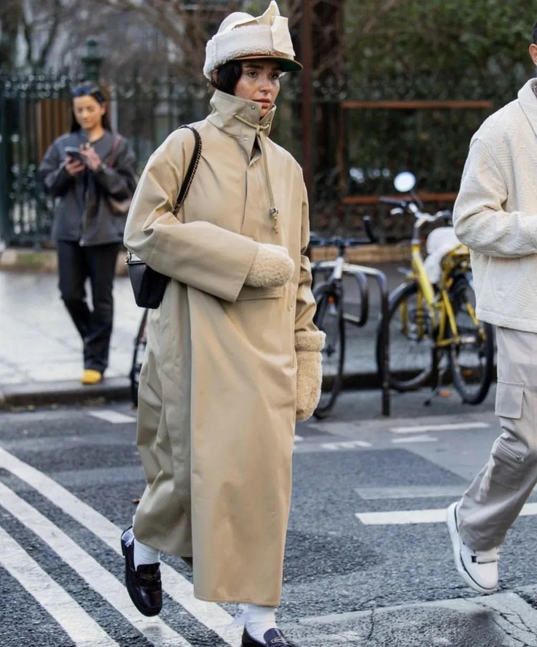 除了可爱的小包,手套和帽子也可以为风衣增加这种可爱柔软的感觉,而且很适合目前还没有完全回暖的早晚出行。