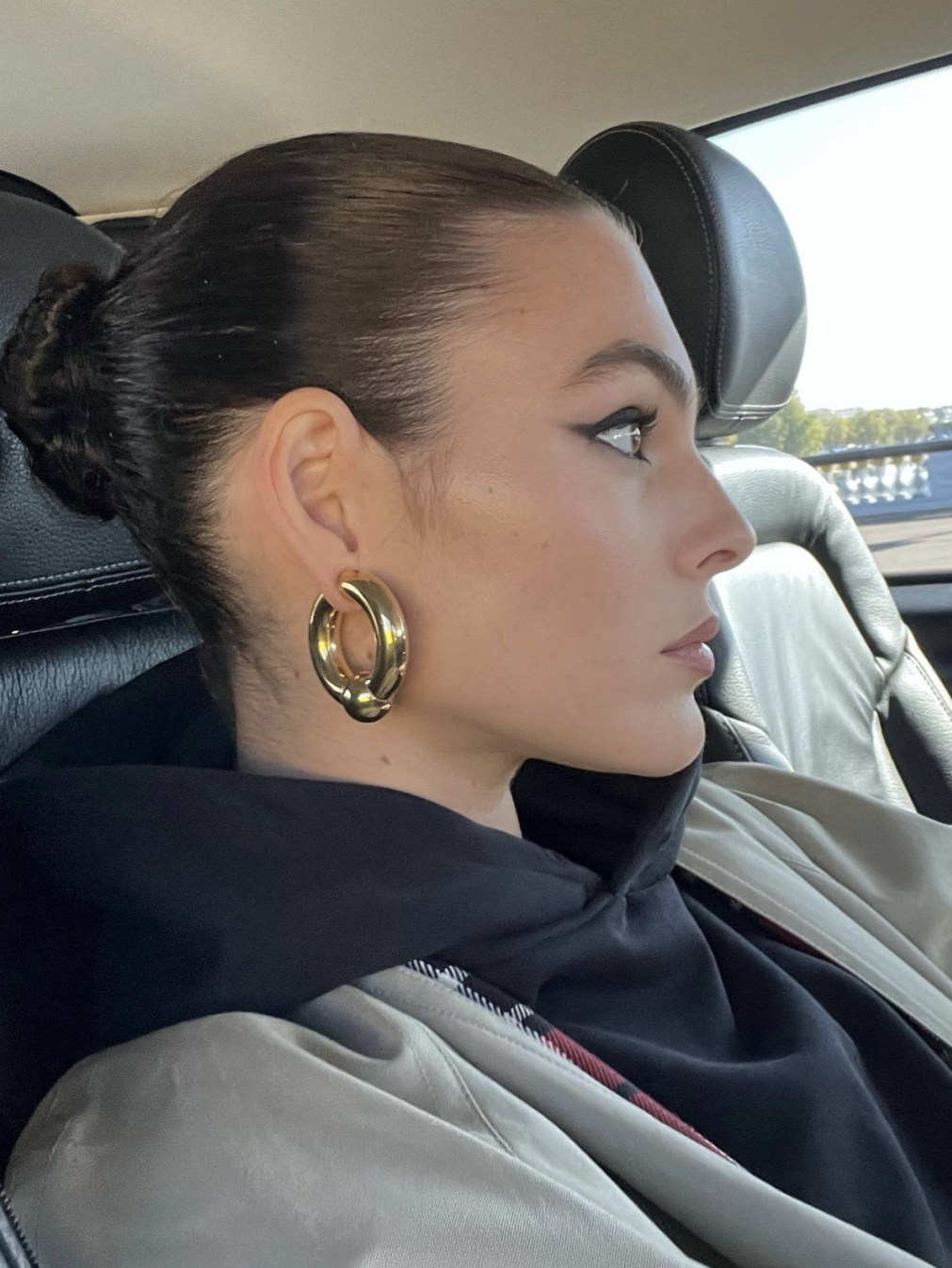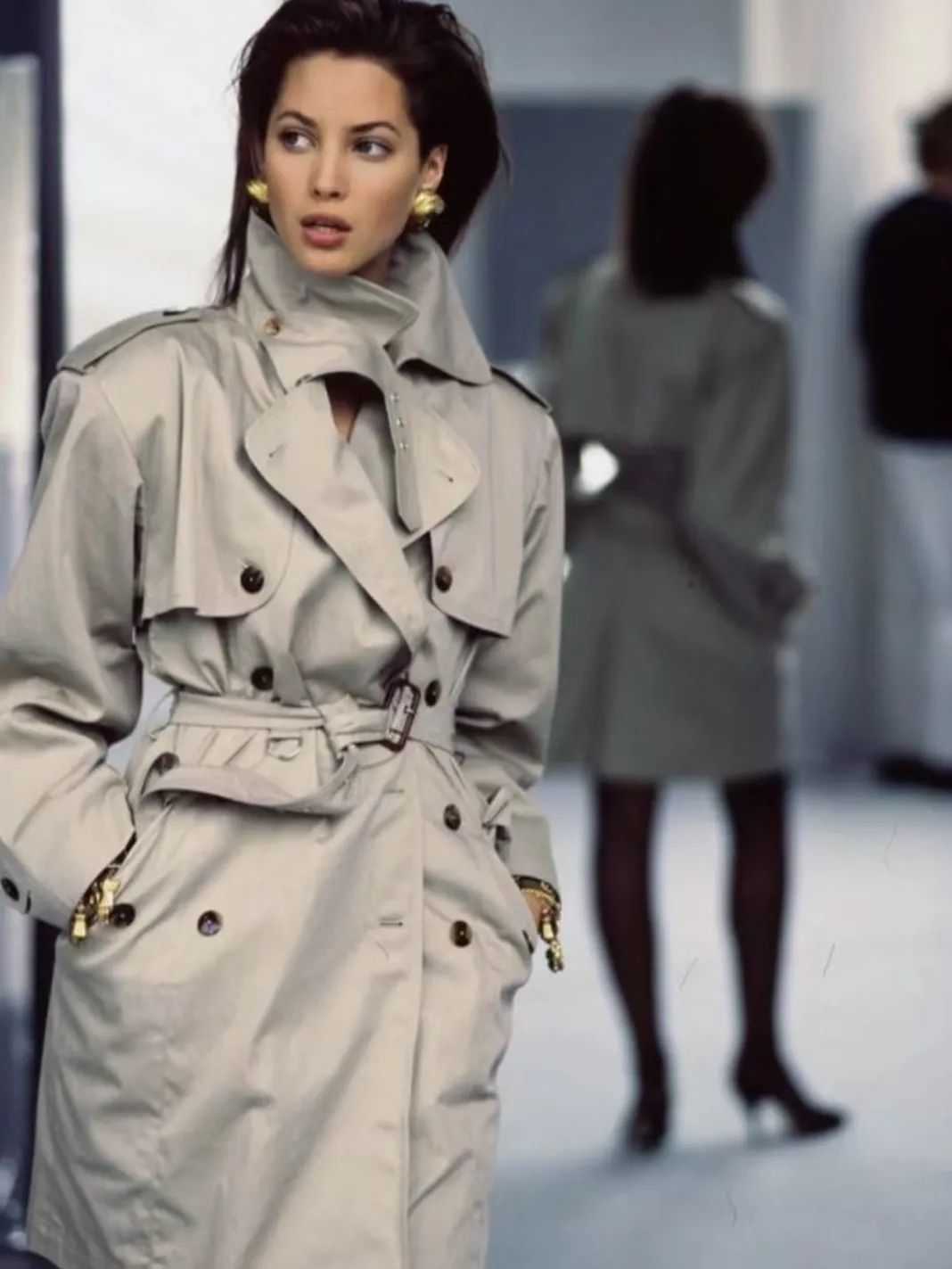 或者从经典中找一些参考,为风衣加一些大体量的配饰,比如金色耳环,很有大女主的气场。