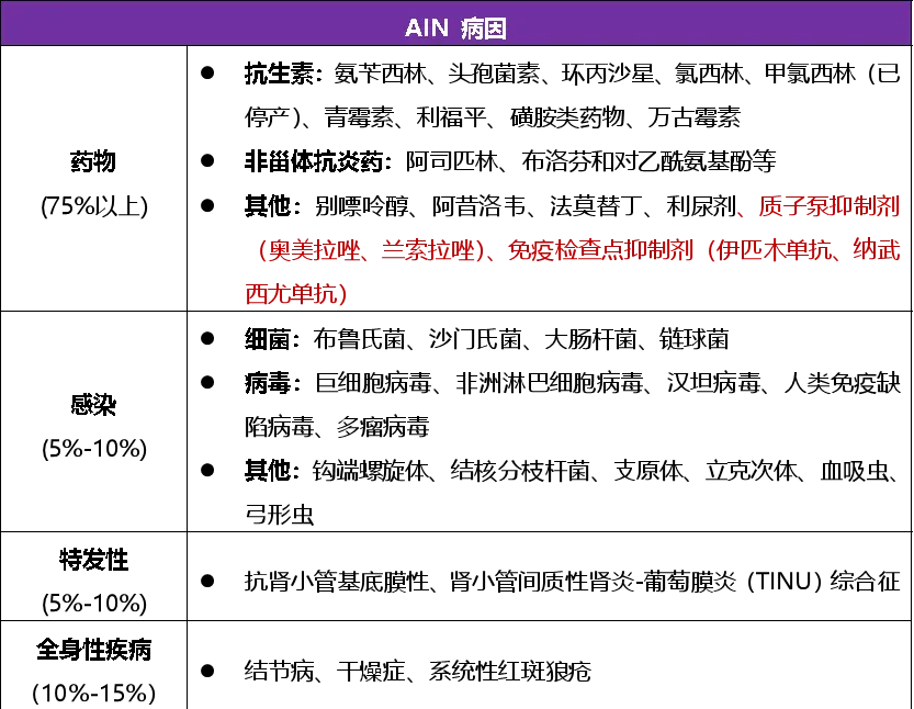 包括药物引起的(最常见,主要是抗生素、非甾体抗炎药)、感染相关的、特发性,以及与结节病和其他全身性疾病相关的 AIN。