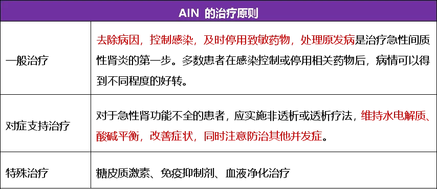(4)AIN 治疗策略主要是针对导致疾病的因素来进行,以消除原因,减轻炎症,防止并发症,以期使肾脏恢复正常功能。