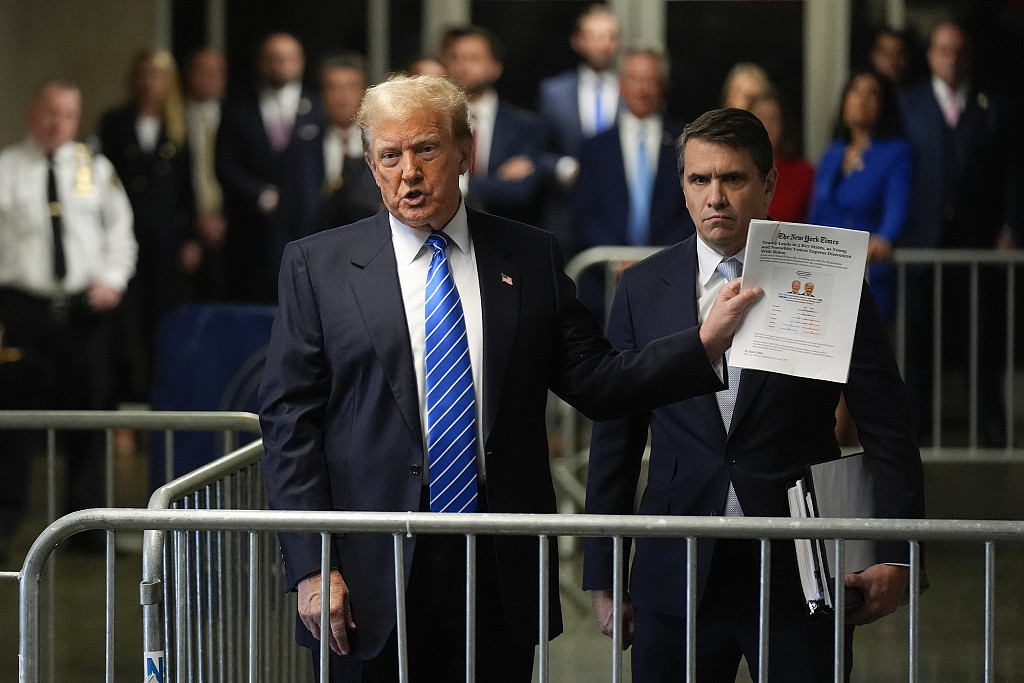 当地时间2024年5月13日,美国纽约,特朗普抵达纽约曼哈顿刑事法庭接受审判时对记者讲话。(视觉中国)