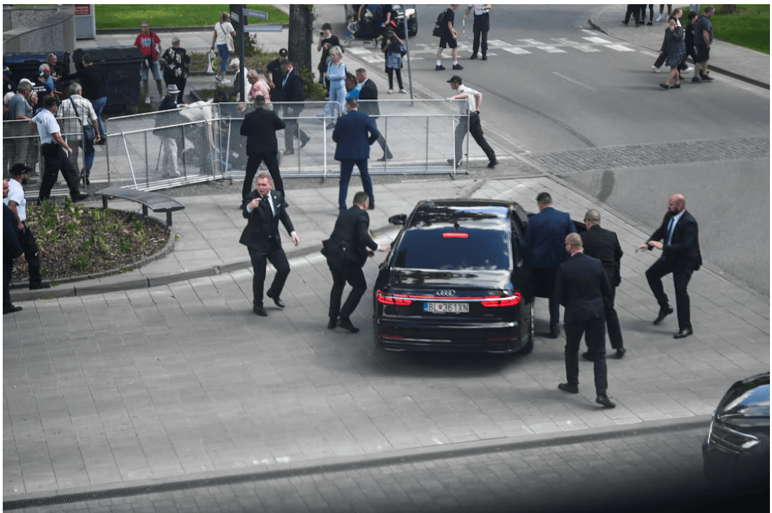 当地时间5月15日,发生枪击事件后,安保人员将罗伯特·菲佐转移到车里 图片转自路透社
