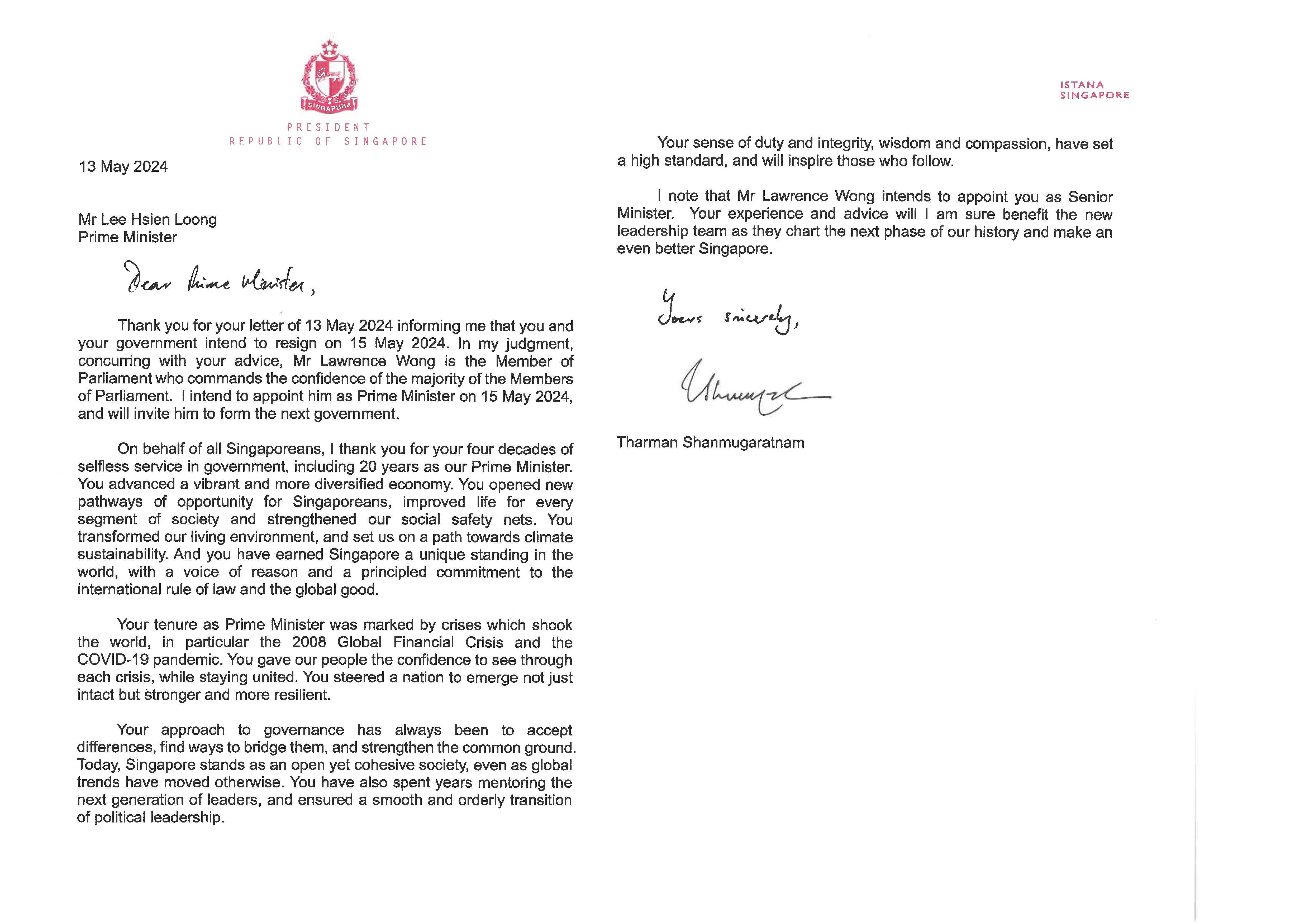 在给李显龙的回信中,尚达曼感谢他从政40多年的无私服务,肯定他把新加坡“塑造成一个有活力且更多元的经济体”,并为新加坡人开创新机会、改善社会各阶层的生活。