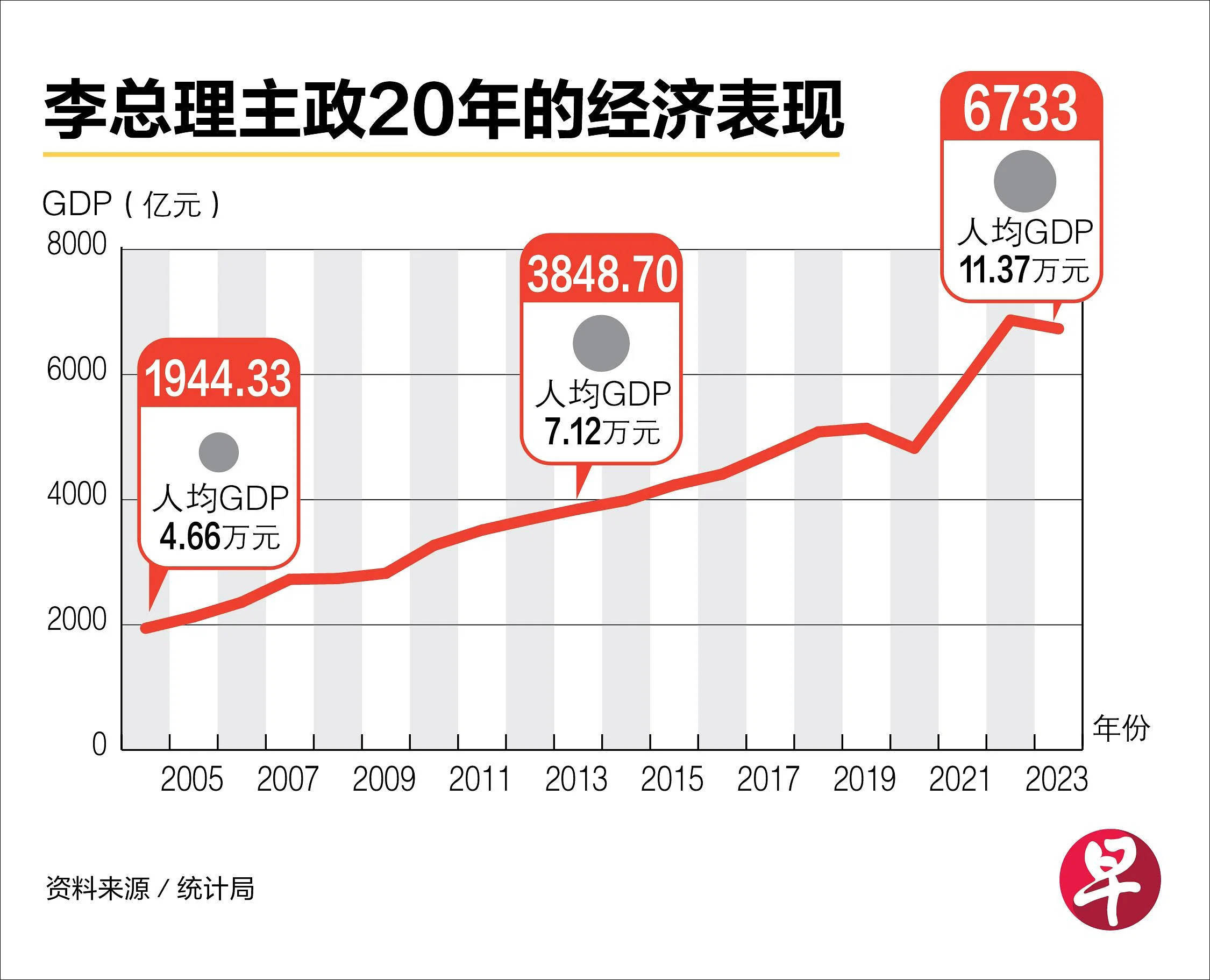 台湾TVBS电视台评价,假如将GDP被视为李显龙的政治成绩单,那他无疑是带领国家前进的经济战略家。从2004年到2023年,新加坡的GDP从1940亿新元增长到6733亿元新元,增长超过4.3倍;人均GDP增加到11.3779万新元,是当年的2.4倍。人均国民总收入(GNI)则从4.38万新元翻倍至9.55万新元。