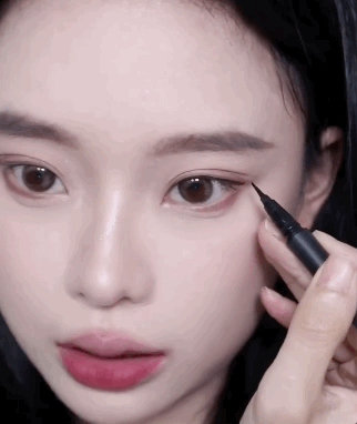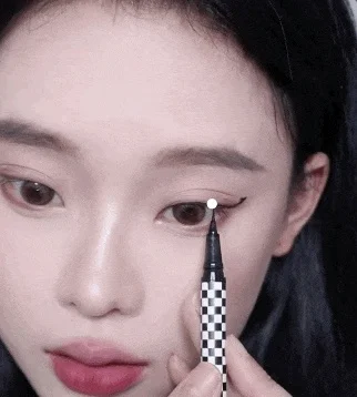 到眼线环节,先顺着睫毛根部画出内眼线,再平视前方,顺着内眼角平移到眼尾,定一个点。