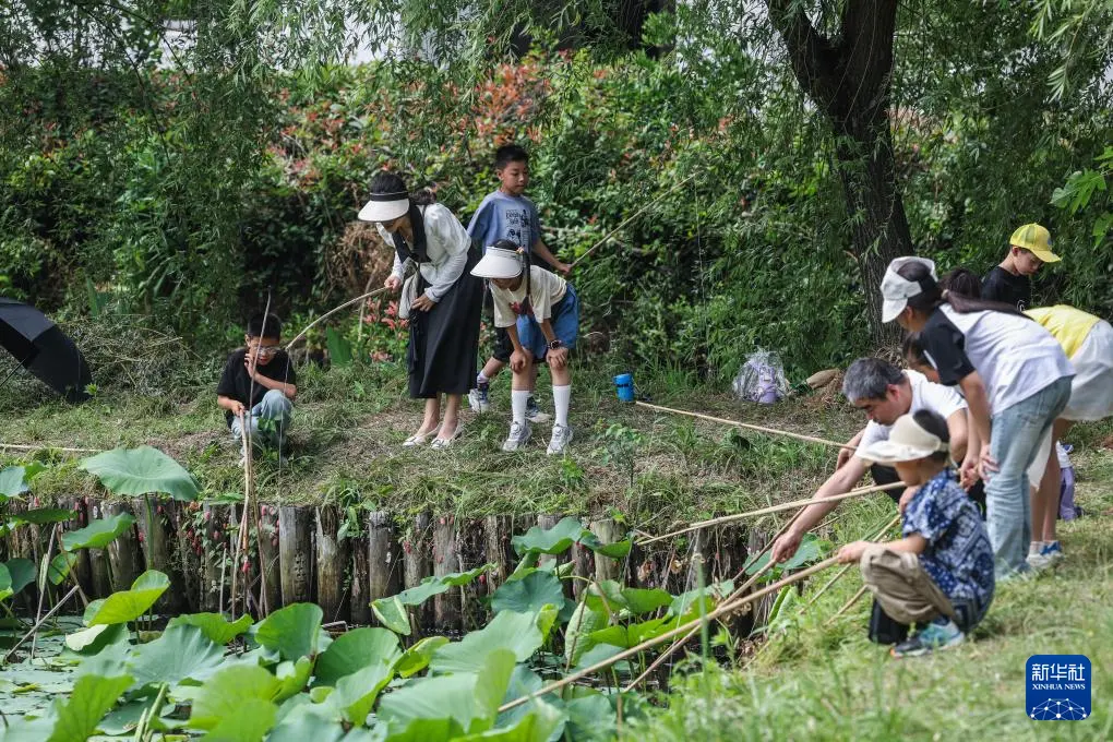 5月25日,在东林镇泉益村活动现场,孩子们在父母的带领下钓小龙虾。