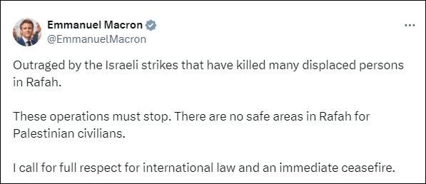 法国总统马克龙27日在社交平台表示对以色列的行动“深感愤慨”,“(我)对以色列的袭击造成拉法许多流离失所者死亡感到愤慨。这些行动必须停止。拉法没有巴勒斯坦平民的安全区。我呼吁充分尊重国际法并立即停火。”