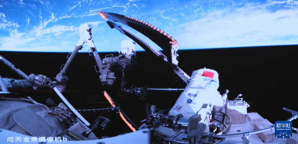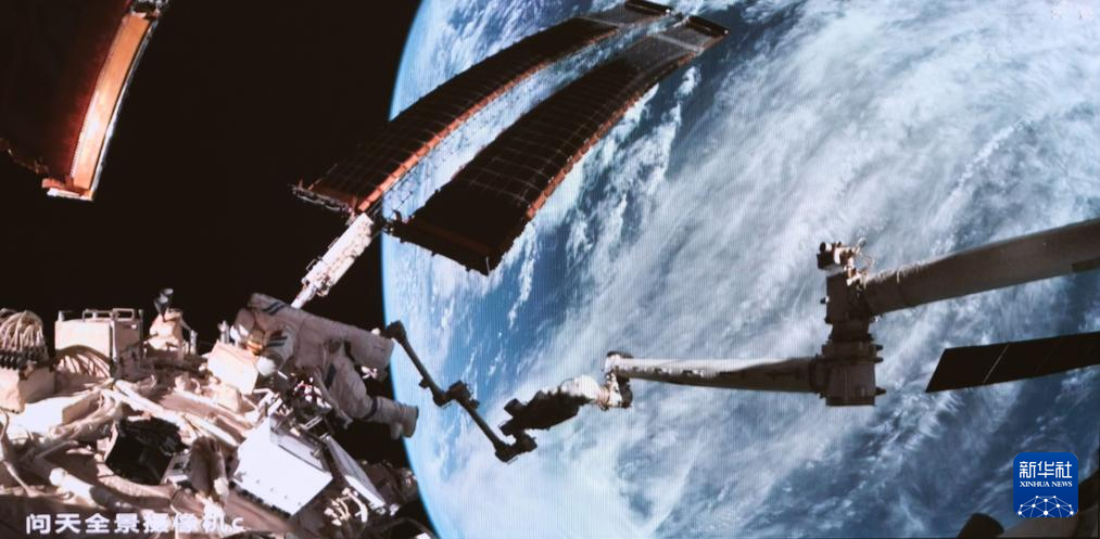 5月28日在北京航天飞行控制中心拍摄的神舟十八号航天员叶光富在空间站机械臂辅助下进行舱外作业的画面。新华社记者 李杰 摄