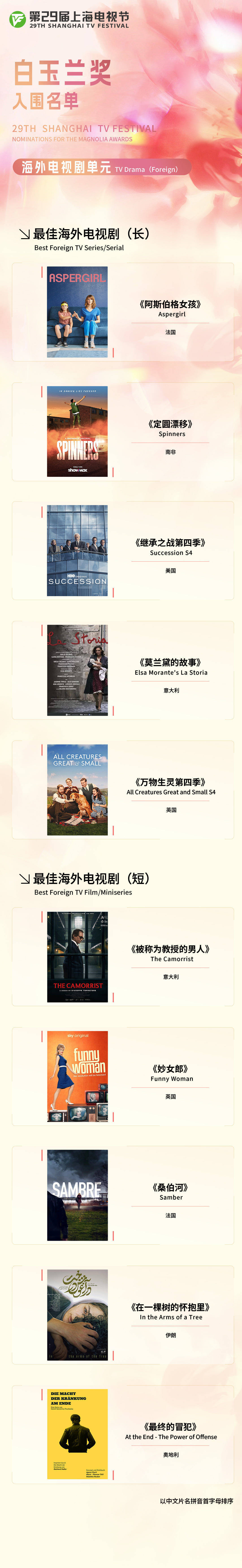 据@上海电视节 透露,今年白玉兰奖各板块征片工作于3月31日结束,共收到来自57个国家和地区的近千部报名作品,创近五个征片周期最高纪录。以电视剧为例,中国剧报名约190部,海外剧从上一年度的近110部增加到了近170部,实现53.7%的增幅。