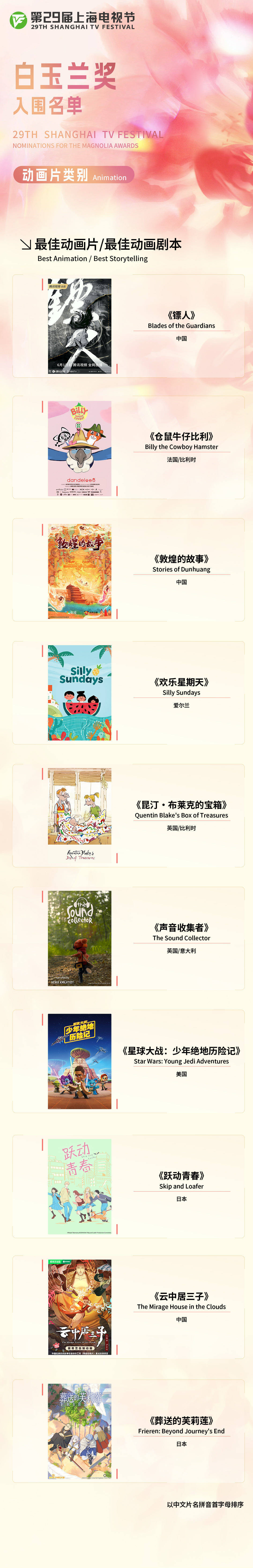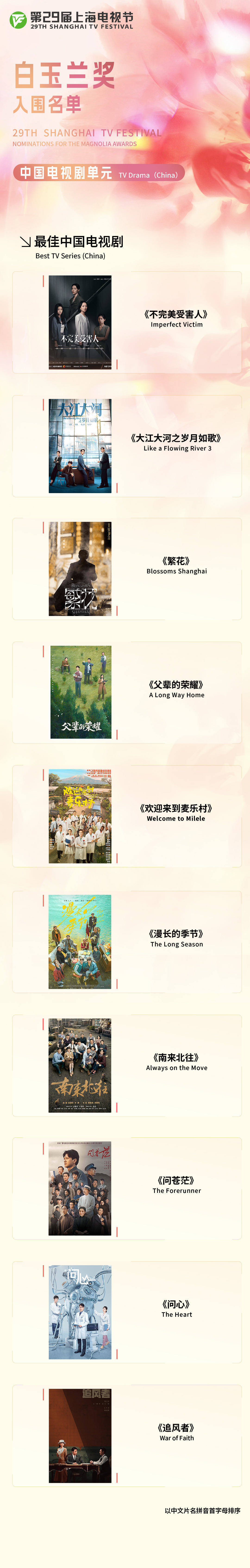 国产剧单元中,极具王家卫个人风格、展现上海独特魅力的《繁花》以最佳中国电视剧、最佳导演、最佳编剧、最佳男主角、最佳女主角等9项提名领跑,优质悬疑作品《漫长的季节》(5提)、把铁路乘警故事搬上荧幕的《南来北往》(5提)紧随其后,《不完美受害人》《大江大河之岁月如歌》《问苍茫》等作品也收获颇丰。