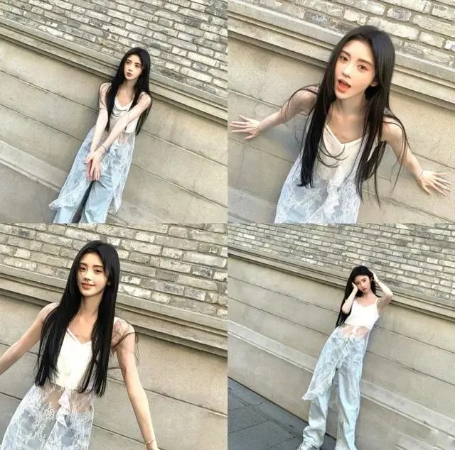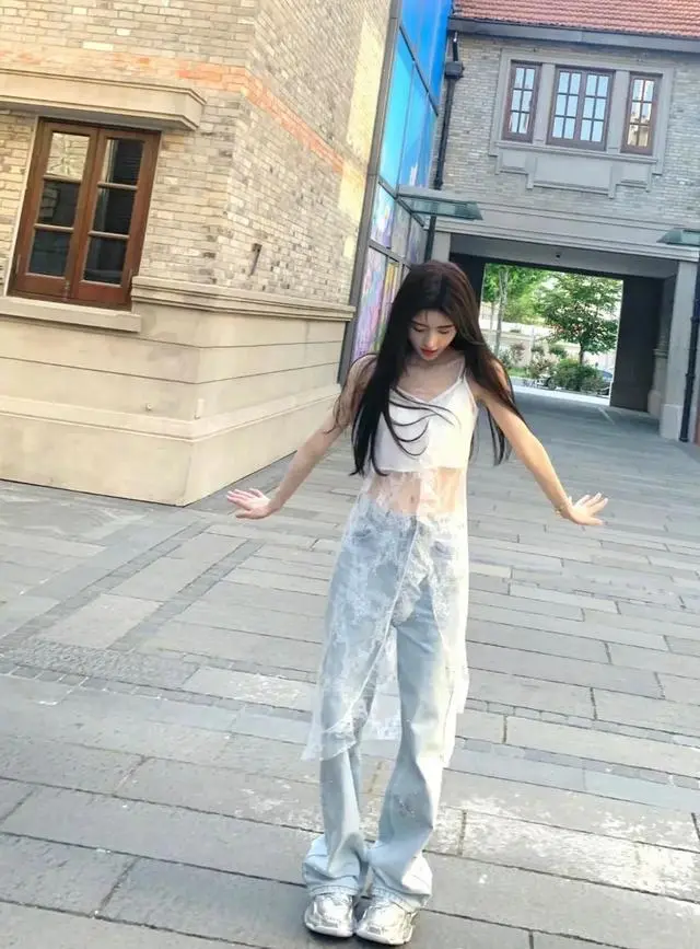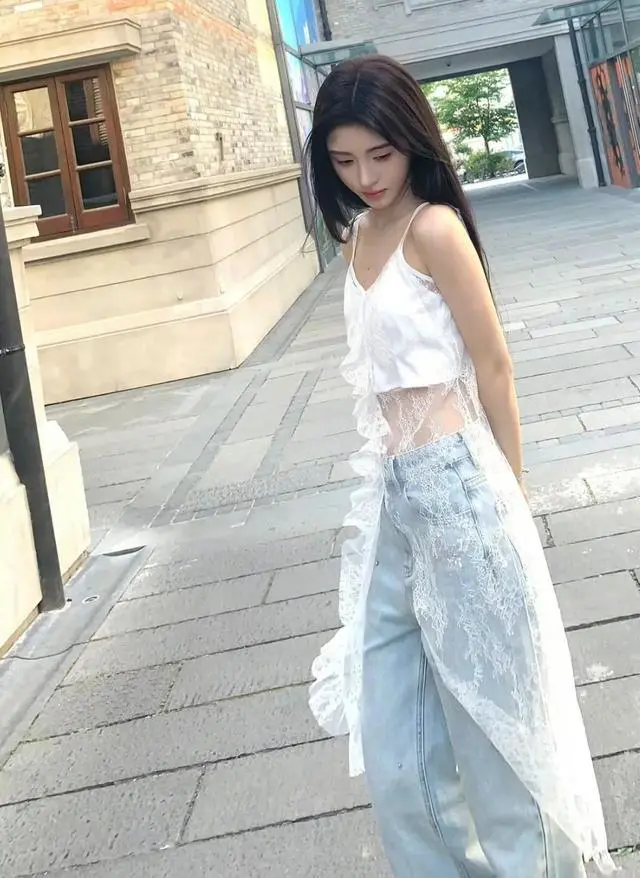 鞠婧祎上身一件不规则蕾丝吊带搭配蝴蝶亮片牛仔裤,整个造型轻盈灵动,蕾丝的裙摆让整个造型多添了一些层次感,谁说少女感不能有新的诠释,牛仔裤也能营造出薄雾少女的灵动感。